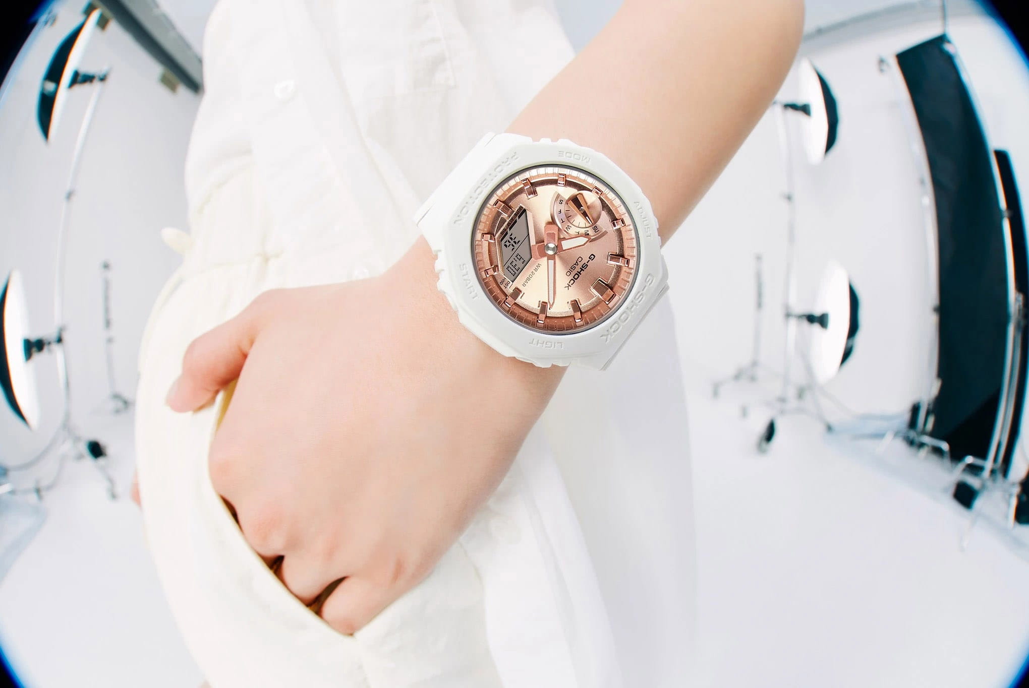 Японские женские часы-хронографХронографФункция позволяет измерять отрезки времени с особой точностью: часы, минуты, секунды. Верным признаком хронографа является наличие на циферблате 3 дополнительных окошек-счётчиков. Casio G-Shock GMA-S2100MD-7A из коллекции G-Shock. Минеральное стеклоМинеральное стеклоМинеральное стекло представляет собой искусственно выращенный минерал кварца. Такое стекло отличается особой устойчивостью к повреждениям и царапинам. Уступает по некоторым качествам сапфировому стеклу. устойчивое к появлению царапин, обладающее высокой прозрачностью. Ударопрочный корпусУдаропрочный корпусМеханизм заключён в корпус, выполненный из современных материалов, устойчивых к ударам, механическим повреждениям и падению с высоты: инновационный пластик, карбон, нержавеющая сталь, титан. защищает механизм от ударов и вибрации. Светодиодная автоподсветка NeobriteПодсветка NeobriteИспользование светонакопительных составов на основе сульфида цинка или алюмината стронция, яркий свет можно наблюдать на протяжении 6-10 часов после «зарядки» часов около источника света. - при повороте часов в сторону лица подсветка дисплея осуществляется автоматически. Настраиваемое послесвечение 1,5 или 3сек. Мировое времяМировое время Полезное часовое усложнение, отображающее время в основных городах и известных областях по всему миру, оно связано с часовыми поясами, удобно для путешественников и бизнесменов. – 48 городов (29 часовых поясов). СекундомерСекундомерСекундоме́р — прибор, способный измерять интервалы времени с точностью до долей секунды. с точностью измерения 1/100 секунды и измерением до 23 часов 59 минут 59,99 cек. ТаймерТаймерОтсчитывает секунды в обратном направлении в заданном интервале времени. обратного отсчета (диапазон времени 24 часа), автоматический календарь, 12/24 отображение времени. 5 будильниковБудильникБуди́льник — часы, в заданный момент времени подающие звуковой, световой и/или в редких случаях другой сигнал., ежечасный сигнал. Переключение между домашним и мировым временем. Класс водозащиты: 200 метров, позволит плавать, нырять и заниматься другими водными видами спорта. Ремешок из полимерного материала на стандартной застежке.