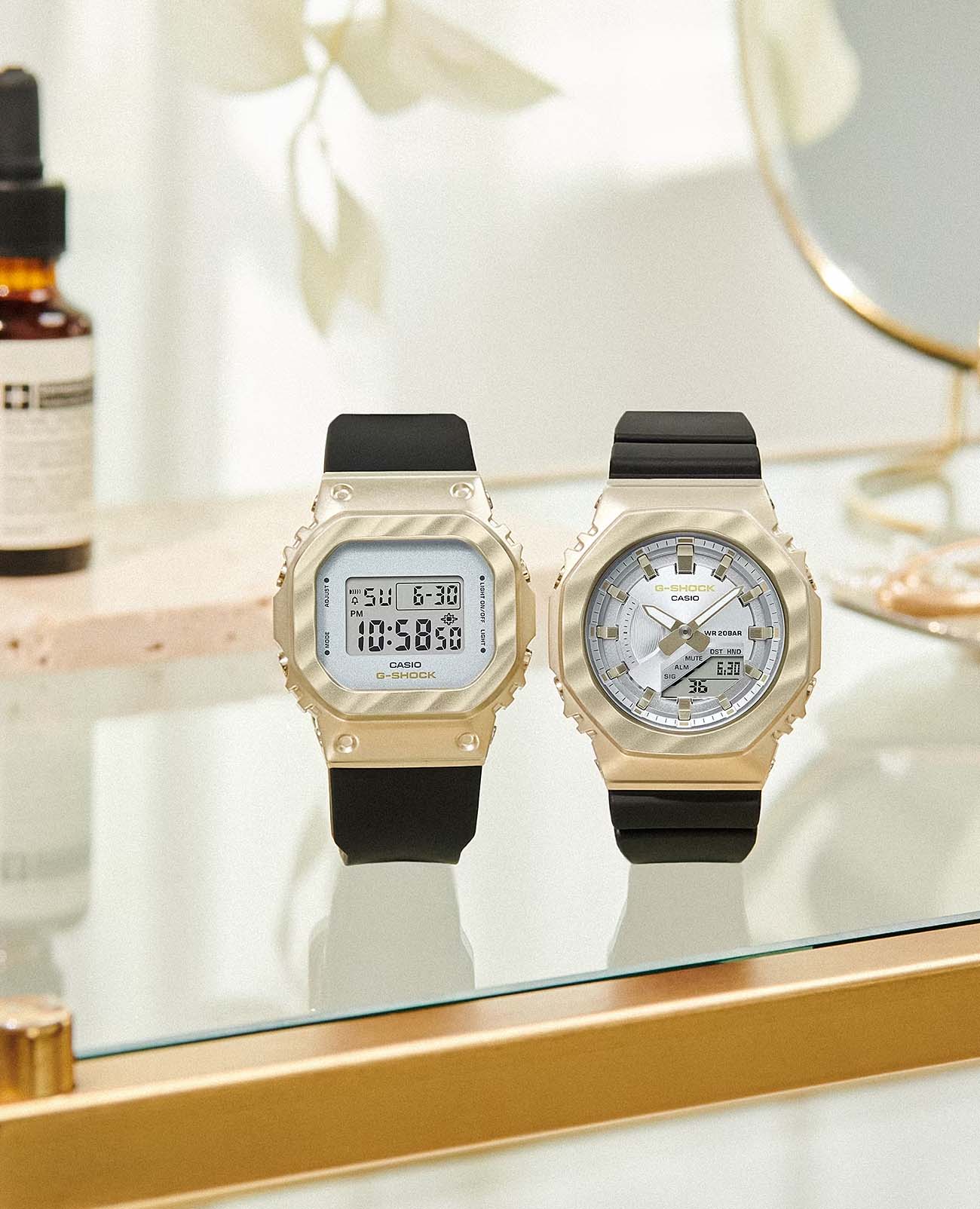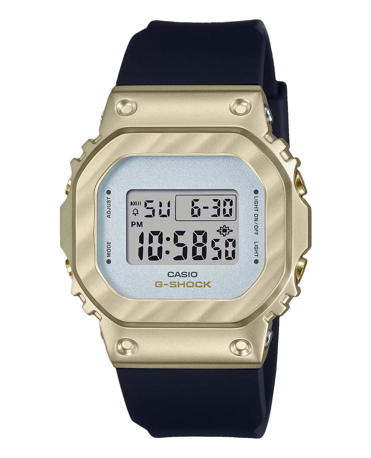 Японские женские часы-хронографХронографФункция позволяет измерять отрезки времени с особой точностью: часы, минуты, секунды. Верным признаком хронографа является наличие на циферблате 3 дополнительных окошек-счётчиков. Casio G-Shock GM-S5600BC-1. Передовая технология ковки придает металлическому безелюБезельВнешний ободок, закрепляющий стекло. В спортивных часах так называется поворотное кольцо с делениями на циферблате, выполняет роль таймера – замеряет отрезки времени на шкале. Неподвижный безель – элемент декора. Однонаправленно вращающийся безель на дайверских часах позволяет фиксировать моменты погружения и выныривания на поверхность., теперь более светлого желто-золотого цвета, вид драпированной ткани. Благодаря ярко контрастирующему черному ремешку, элегантному и изысканному дизайну эти часы займут достойное место в вашей шкатулке для украшений. Минеральное стеклоМинеральное стеклоМинеральное стекло представляет собой искусственно выращенный минерал кварца. Такое стекло отличается особой устойчивостью к повреждениям и царапинам. Уступает по некоторым качествам сапфировому стеклу. устойчивое к появлению царапин, обладающее высокой прозрачностью. Ударопрочный корпусУдаропрочный корпусМеханизм заключён в корпус, выполненный из современных материалов, устойчивых к ударам, механическим повреждениям и падению с высоты: инновационный пластик, карбон, нержавеющая сталь, титан. с IP-покрытиемIP-покрытиеМетод ионного напыления. Демонстрирует повышенную устойчивость к истиранию, окислению и химическим веществам. Под воздействием высокого давления и температуры около 1500°C молекулы металла надёжно соединяются с частицами корпуса часов. защищает механизм от ударов и вибрации. Светодиодная подсветкаСветодиодная подсветкаСветодиодная или LED-подсветка обеспечивает появление яркого холодного свечения за счёт LED-элементов - маленьких лампочек. Они потребляют минимальное количество энергии, чаще всего можно встретить 1 светодиод, в нижней части циферблата. освещает весь циферблат, после отпускания кнопки свечение продолжается еще некоторое время. Настраиваемое послесвечение 1,5 или 3сек. СекундомерСекундомерСекундоме́р — прибор, способный измерять интервалы времени с точностью до долей секунды. с точностью измерения 1/100 секунды и измерением до 23 часов 59 минут 59,99 cек. ТаймерТаймерОтсчитывает секунды в обратном направлении в заданном интервале времени. обратного отсчета (диапазон времени 24 часа), автоматический календарь, 12/24 отображение времени. будильникБудильникБуди́льник — часы, в заданный момент времени подающие звуковой, световой и/или в редких случаях другой сигнал., ежечасный сигнал. Батарея рассчитана на 3 года. Класс водозащиты: 200 метров, позволит плавать, нырять и заниматься другими водными видами спорта. Ремешок из полимерного материала на стандартной застежке.