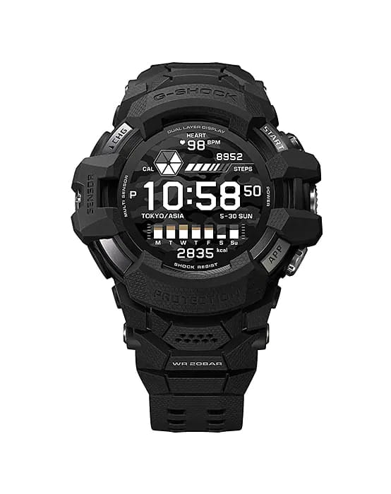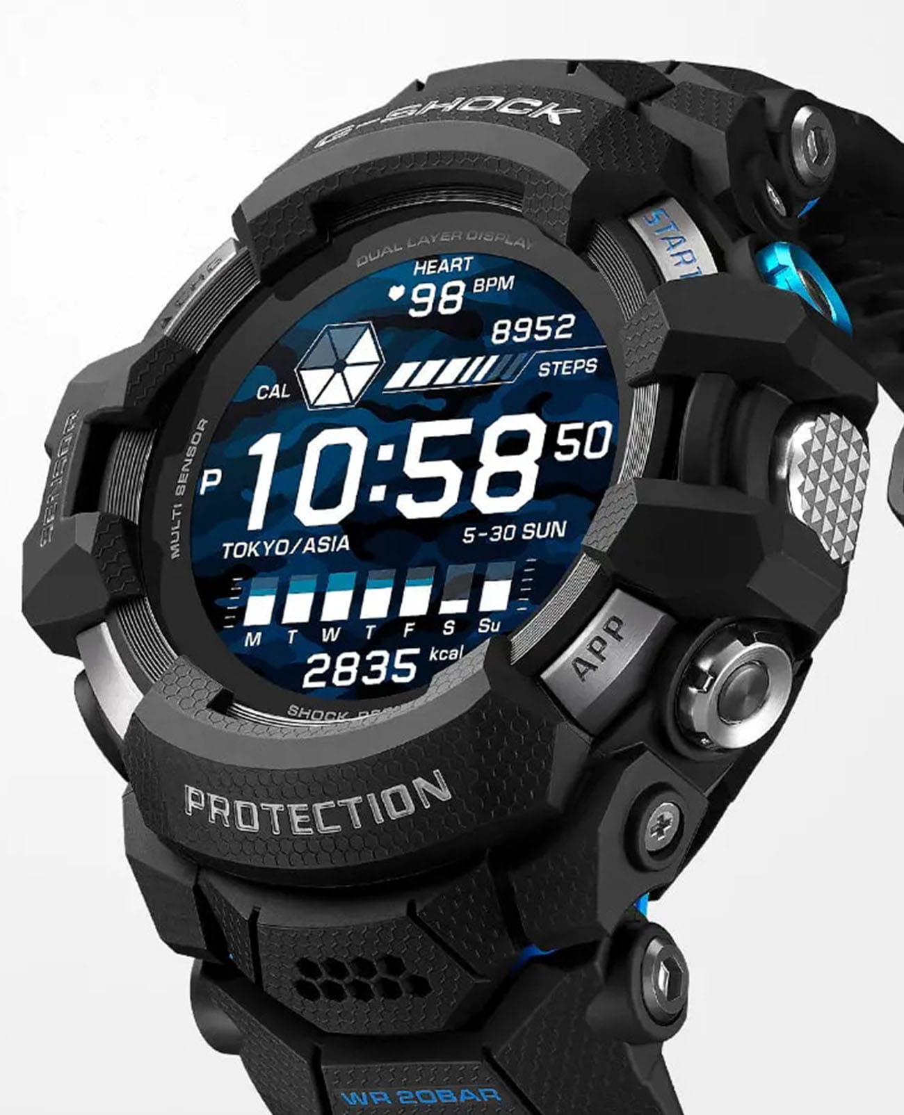 Первые смарт-часы в линейке G-Shock из серии GSW-H1000 на базе полноценной Wear OS от Google. Модель в черной стелс-расцветке со стальным безелем получила двойной сенсорный дисплей: цветной 360×360 TFT LCD дисплей для полноценного режима и черно-белый для экономного, в котором часы могут отображать время и показатели датчиков в течение месяца без подзарядки. В часах установлен литий-ионный аккумулятор, полностью заряжающийся от магнитной USB-зарядки за 3 часа.
