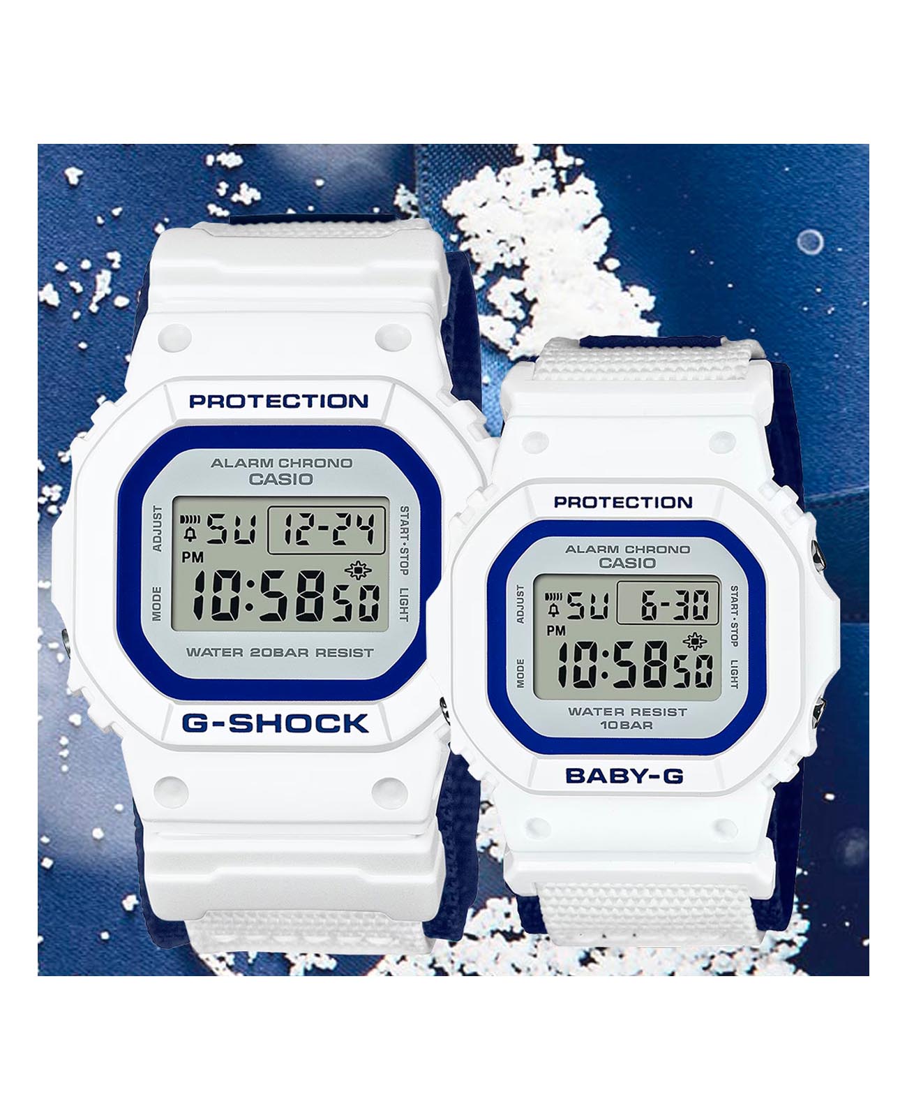 В этом году G представляет коллекцию Lover's Collection LOV-23A-7, в которую входят G-Shock DW-5600 и Baby-G BGD-565. В часах использованы белый и синий цвета и тканевые ремешки первой коллекции Lover's, выпущенной в 1996 году. Эти часы, выпущенные ограниченным тиражом, украшены вышитыми ангелом и дьяволом бирками на нижних ремешках, графическими изображениями red angel (BGD-565) и devil (DW-5600) на светодиодной подсветкеСветодиодная подсветкаСветодиодная или LED-подсветка обеспечивает появление яркого холодного свечения за счёт LED-элементов - маленьких лампочек. Они потребляют минимальное количество энергии, чаще всего можно встретить 1 светодиод, в нижней части циферблата. и специальной гравировкой Lover's Collection на задней крышке корпуса из нержавеющей стали. Обе пары имеют ударопрочный корпусУдаропрочный корпусМеханизм заключён в корпус, выполненный из современных материалов, устойчивых к ударам, механическим повреждениям и падению с высоты: инновационный пластик, карбон, нержавеющая сталь, титан., часовой сигнал времени, секундомерСекундомерСекундоме́р — прибор, способный измерять интервалы времени с точностью до долей секунды., таймерТаймерОтсчитывает секунды в обратном направлении в заданном интервале времени., многофункциональный будильникБудильникБуди́льник — часы, в заданный момент времени подающие звуковой, световой и/или в редких случаях другой сигнал., 12 и 24-часовой формат времени, вечный календарьВечный календарьКлассическое часовое усложнение, представляющее собой календарь, рассчитанный на несколько лет вперёд (стандартно – до 2099 года). Определяет текущую дату, день недели, месяц.. Стилизованная светодиодная подсветкаСветодиодная подсветкаСветодиодная или LED-подсветка обеспечивает появление яркого холодного свечения за счёт LED-элементов - маленьких лампочек. Они потребляют минимальное количество энергии, чаще всего можно встретить 1 светодиод, в нижней части циферблата. освещает весь циферблат, после отпускания кнопки свечение продолжается еще некоторое время. Тканевый ремешок на стандартной застежке. G-Shock DW-5600 имеет вес 57гр, парметры: 48.9 × 42.8 × 13.4 мм. Класс водозащиты: 200 метров, позволит плавать, нырять и заниматься другими водными видами спорта. Baby-G BGD-565 имеет вес 35гр, параметры: 42.1 × 37.9 × 11.3 мм. Класс водозащиты: 100 метров, позволит плавать, нырять и заниматься другими водными видами спорта.