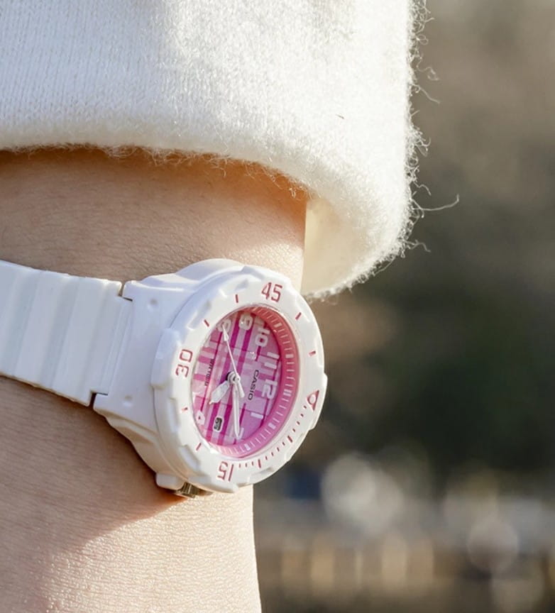 Женские японские наручные часы Casio Collection LRW-200H-4C. Кварцевый механизм с высокой точностью +/- 20 сек в месяц.Сочетают в себе стильный и яркий дизайн вкупе с практичностью и комфортом. Время отображается в в 12- и 24-часовом форматах. Вращающийся безельБезельВнешний ободок, закрепляющий стекло. В спортивных часах так называется поворотное кольцо с делениями на циферблате, выполняет роль таймера – замеряет отрезки времени на шкале. Неподвижный безель – элемент декора. Однонаправленно вращающийся безель на дайверских часах позволяет фиксировать моменты погружения и выныривания на поверхность.. Легкий вес в 25 грамм. Есть миниатюрный календарь. Водонепроницаемость 100 метров, позволит плавать, нырять и заниматься другими водными видами спорта.Стрелки с люминесцентным покрытиемЛюминесцентное покрытиеПозволяет считывать показания времени в темноте. Производители наносят на стрелки, часовые индексы, безель или поверхность циферблата светонакопительный состав, дающий холодное свечение..