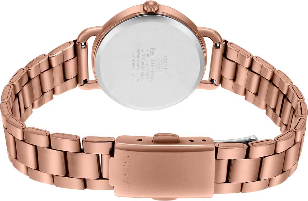 Японские женские часы Casio Collection LTP-E412PG-4A из коллекции LTP с минеральным стекломМинеральное стеклоМинеральное стекло представляет собой искусственно выращенный минерал кварца. Такое стекло отличается особой устойчивостью к повреждениям и царапинам. Уступает по некоторым качествам сапфировому стеклу. изящно смотрятся на запястье, они привлекают классическим исполнением и правильной геометрией. Минималистичная модель станет отличным решением для любого случая: на работу, переговоры с деловыми партнёрами, прогулку с друзьями или праздничный вечер. Отсутствуют лишние детали, что позволяет часам быть актуальными на долгие годы. Корпус и браслет выполнены из стали с IP-покрытиемIP-покрытиеМетод ионного напыления. Демонстрирует повышенную устойчивость к истиранию, окислению и химическим веществам. Под воздействием высокого давления и температуры около 1500°C молекулы металла надёжно соединяются с частицами корпуса часов.. Браслет с раскладной застёжкойРаскладная застёжкаТакой тип застёжки используется только на браслетах из металла. Она никогда не раскрывается полностью, происходит разделение на 2 и более частей. Раскладывающая застёжка снизит вероятность потери часов к минимуму.. Модель комплектуется надёжным механизмом, точность хода которого составляет +/- 20 сек/мес.