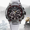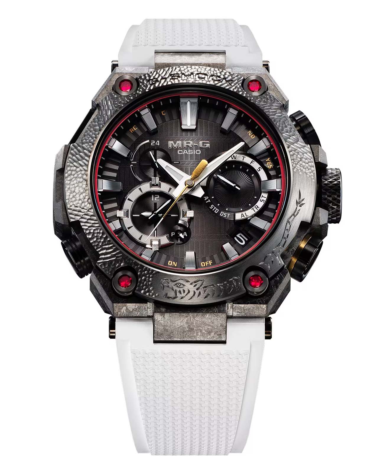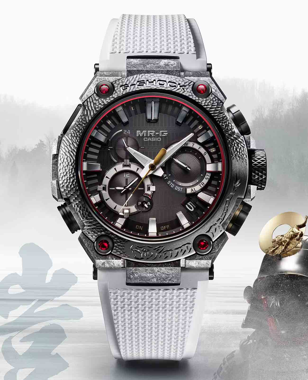 Японские мужские часы Casio G-Shock MRG-B2000SG-1A – дань богатой на легенды и события истории Японии. Восславляя мастерство древних японских ремесленников, эти потрясающие часы успешно воплощают дух самураев, легендарных и искусных воинов. Одновременно с этим, модель инкорпорирует в свой облик знаменитый кабуто-шлем Shougeki-Maru: Gai, который был изготовлен Casio специально для линейки MR-G.  Кабуто — это японский боевой шлем, который использовался самураями в период эдо, и считался крайне важным элементом экипировки, а также символом чести и силы. На безелеБезельВнешний ободок, закрепляющий стекло. В спортивных часах так называется поворотное кольцо с делениями на циферблате, выполняет роль таймера – замеряет отрезки времени на шкале. Неподвижный безель – элемент декора. Однонаправленно вращающийся безель на дайверских часах позволяет фиксировать моменты погружения и выныривания на поверхность. с DLC-покрытиемDLC-покрытиеDiamond like carbon - одно из лучших видов покрытия, представляющее собой углерод с алмазными свойствами. На поверхность материала наносятся распавшиеся молекулы углерода, превращающиеся в плёнку из алмазоподобных связей, которая перенимает твёрдость алмаза. изображен золотой гребень этого совершенно особенного шлема с рисунком в виде тигра и каменнозернистым рельефом, искусно выгравированным мастером по металлу Кобаяси Масао. Все часы ограниченной серии - единственные в своем роде, с ручной гравировкой, выполненной мастером-изготовителем. Ударопрочный корпусУдаропрочный корпусМеханизм заключён в корпус, выполненный из современных материалов, устойчивых к ударам, механическим повреждениям и падению с высоты: инновационный пластик, карбон, нержавеющая сталь, титан. защищает механизм от ударов и вибрации.Сапфировое стеклоСапфировое стеклоПрочный и надёжный материал из кристалла сапфира синтетического происхождения, характеризующийся особой твёрдостью и устойчивостью к царапинам и повреждениям. устойчивое к появлению царапин, обладающее высокой прозрачностью. Светодиодная подсветкаСветодиодная подсветкаСветодиодная или LED-подсветка обеспечивает появление яркого холодного свечения за счёт LED-элементов - маленьких лампочек. Они потребляют минимальное количество энергии, чаще всего можно встретить 1 светодиод, в нижней части циферблата. (Super Illuminator), послесвечение. Двойное время, 27 часовых поясов, смена времени в домашнем городе, автоматическое переключение летнего времени (DST). 12/24-часовой формат. Вечный календарьВечный календарьКлассическое часовое усложнение, представляющее собой календарь, рассчитанный на несколько лет вперёд (стандартно – до 2099 года). Определяет текущую дату, день недели, месяц.. СекундомерСекундомерСекундоме́р — прибор, способный измерять интервалы времени с точностью до долей секунды.. ТаймерТаймерОтсчитывает секунды в обратном направлении в заданном интервале времени.. Ежедневный будильник. Автоматическая коррекция исходного положения стрелки. Класс водозащиты: 200 метров, позволит плавать, нырять и заниматься другими водными видами спорта. Ремешок из полимерного материала на раскладной застёжкеРаскладная застёжкаТакой тип застёжки используется только на браслетах из металла. Она никогда не раскрывается полностью, происходит разделение на 2 и более частей. Раскладывающая застёжка с