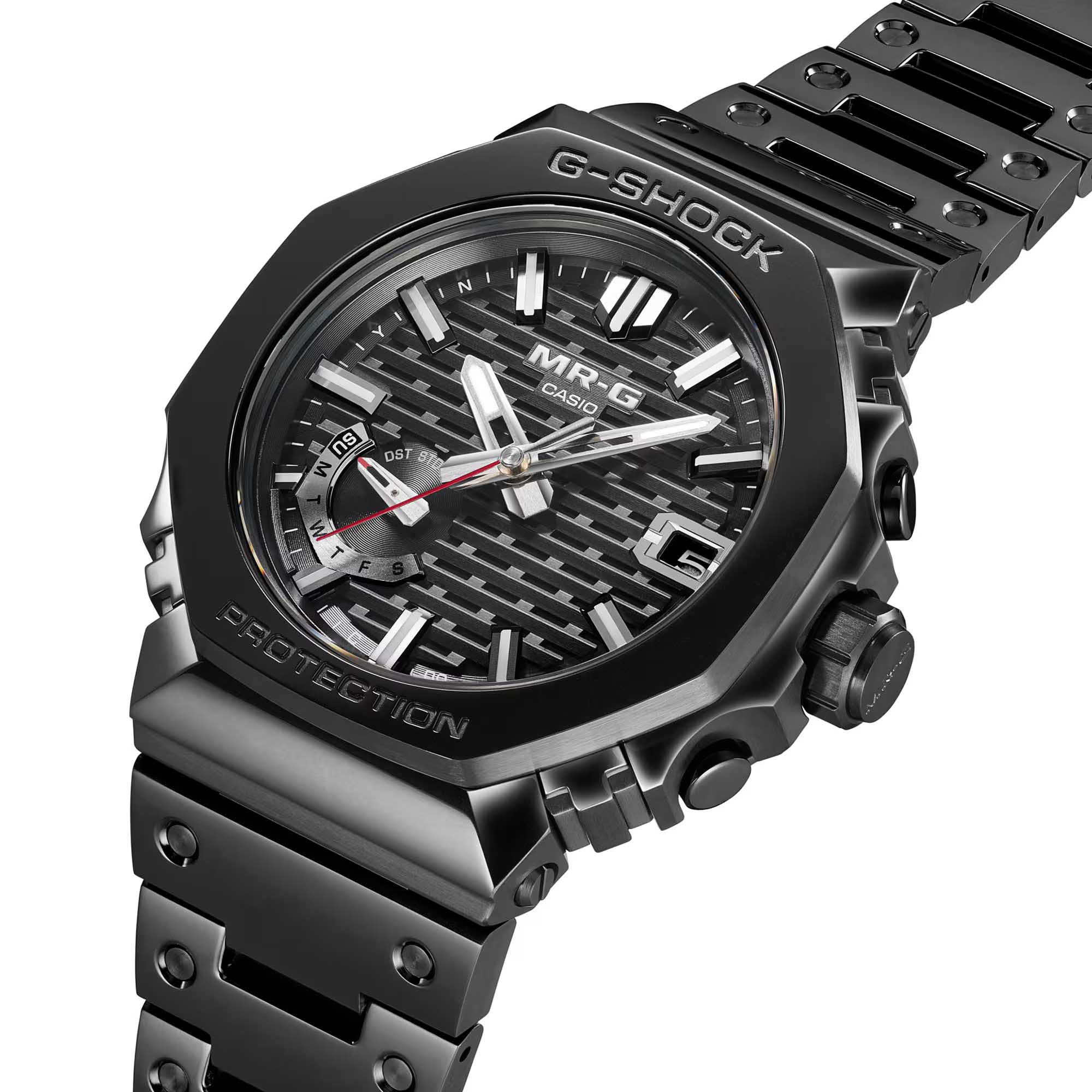 Casio представляет первую модель из линейки G-SHOCK 2100, получившую название MR-G. Модель MRGB2100 представляет собой образец ювелирного мастерства, корпус и безельБезельВнешний ободок, закрепляющий стекло. В спортивных часах так называется поворотное кольцо с делениями на циферблате, выполняет роль таймера – замеряет отрезки времени на шкале. Неподвижный безель – элемент декора. Однонаправленно вращающийся безель на дайверских часах позволяет фиксировать моменты погружения и выныривания на поверхность. которой изготовлены из сверхтвердого титанового сплава Ti64. Верхняя часть безеля изготовлена из КОБАРИОНА - сплава, который в четыре раза прочнее чистого титана и по блеску сравним с платиной. Браслет изготовлен из другого специального титанового сплава, DAT55G, который одновременно является чрезвычайно прочным и хорошо поддается обработке. Один только безель состоит из 27 различных компонентов, каждый из которых индивидуально отполирован для получения потрясающей детализированной текстуры. Ультрасовременная конструкция Multi-Guard включает в себя буферы между частями многокомпонентного безеля и корпуса, обеспечивающие превосходную амортизацию безеля, и защищает специальный модуль MR-G с помощью позолоченной фиксирующей пластины.