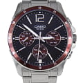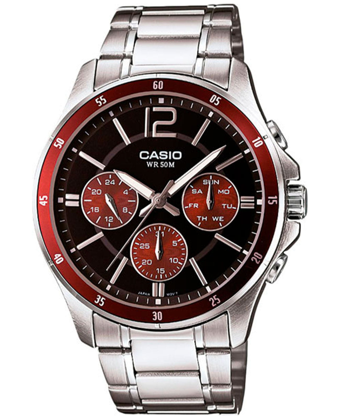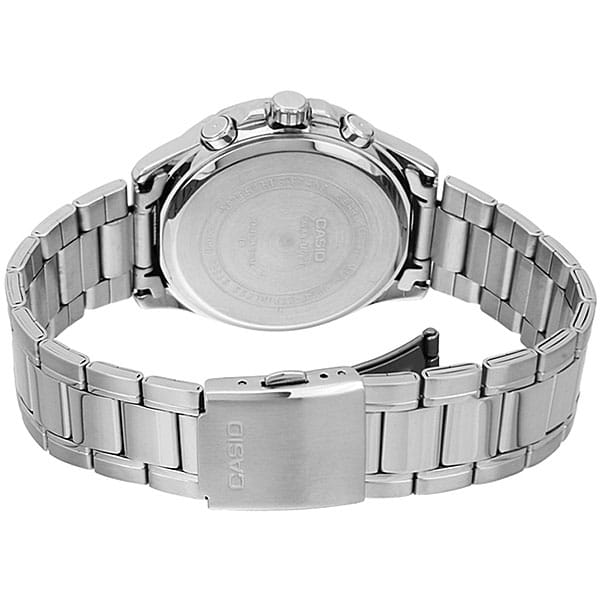 Японские мужские наручные часы с минеральным стекломМинеральное стеклоМинеральное стекло представляет собой искусственно выращенный минерал кварца. Такое стекло отличается особой устойчивостью к повреждениям и царапинам. Уступает по некоторым качествам сапфировому стеклу. Casio Collection MTP-1374D-5A, кварцевый механизм с высокой точностью. Класс водозащиты: 50 метров, позволит защитить корпус от случайных брызг или капель дождя. Корпус часов изготовлен из стали. Стальной браслет на раскладной застёжкеРаскладная застёжкаТакой тип застёжки используется только на браслетах из металла. Она никогда не раскрывается полностью, происходит разделение на 2 и более частей. Раскладывающая застёжка снизит вероятность потери часов к минимуму.. Стрелки с люминесцентным покрытиемЛюминесцентное покрытиеПозволяет считывать показания времени в темноте. Производители наносят на стрелки, часовые индексы, безель или поверхность циферблата светонакопительный состав, дающий холодное свечение.. 12-ти и 24-х часовой формат времени, число и день недели вынесены на отдельные циферблаты. Метки в виде штрихов и арабской цифры 12. Заводная головка с защитой. БезельБезельВнешний ободок, закрепляющий стекло. В спортивных часах так называется поворотное кольцо с делениями на циферблате, выполняет роль таймера – замеряет отрезки времени на шкале. Неподвижный безель – элемент декора. Однонаправленно вращающийся безель на дайверских часах позволяет фиксировать моменты погружения и выныривания на поверхность. с IP-покрытиемIP-покрытиеМетод ионного напыления. Демонстрирует повышенную устойчивость к истиранию, окислению и химическим веществам. Под воздействием высокого давления и температуры около 1500°C молекулы металла надёжно соединяются с частицами корпуса часов..
