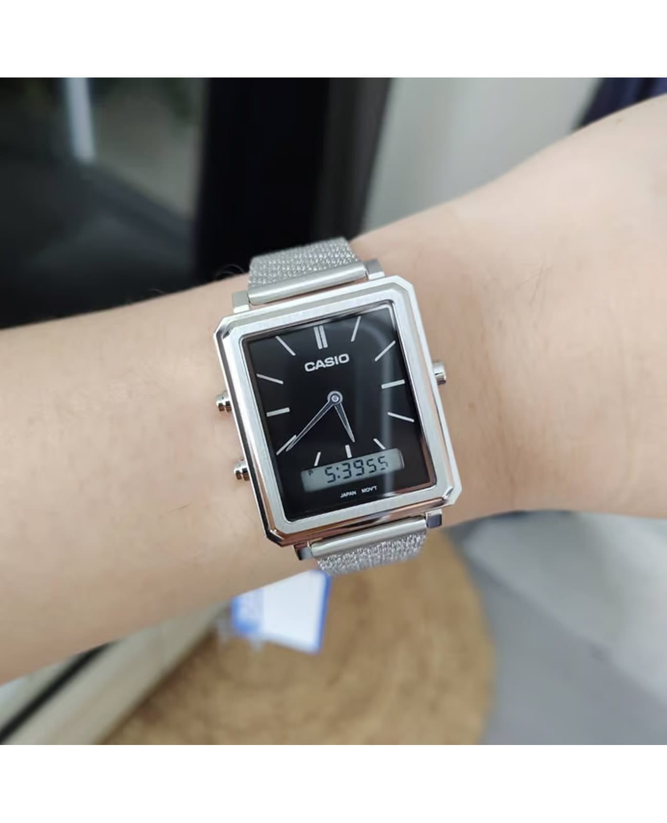 Японские мужские часы- хронографХронографФункция позволяет измерять отрезки времени с особой точностью: часы, минуты, секунды. Верным признаком хронографа является наличие на циферблате 3 дополнительных окошек-счётчиков. с минеральным стекломМинеральное стеклоМинеральное стекло представляет собой искусственно выращенный минерал кварца. Такое стекло отличается особой устойчивостью к повреждениям и царапинам. Уступает по некоторым качествам сапфировому стеклу. Casio Collection MTP-B205M-1EDF, кварцевый механизм с высокой точностью. Корпус часов изготовлен из стали. Мужские аналогово-цифровые часы. 12 и 24-часовой формат времени. СекундомерСекундомерСекундоме́р — прибор, способный измерять интервалы времени с точностью до долей секунды. с точностью показаний 1/100с и временем измерения 60мин. Второй часовой пояс. Циферблат с метками в виде штрихов. БудильникБудильникБуди́льник — часы, в заданный момент времени подающие звуковой, световой и/или в редких случаях другой сигнал., ежечасный сигнал. Батарея рассчитана на 3 года. Класс водозащиты: 50 метров, позволит защитить корпус от случайных брызг или капель дождя. Стальной браслет миланского плетения на раскладном замкеРаскладной замокДанный вариант застежки используется только на часах с металлическим браслетом. Отличительная особенность такого крепления в том, что длина браслета становится универсальной и вы можете самостоятельно отрегулировать нужный вам размер – застежка просто двигается по браслету часов..