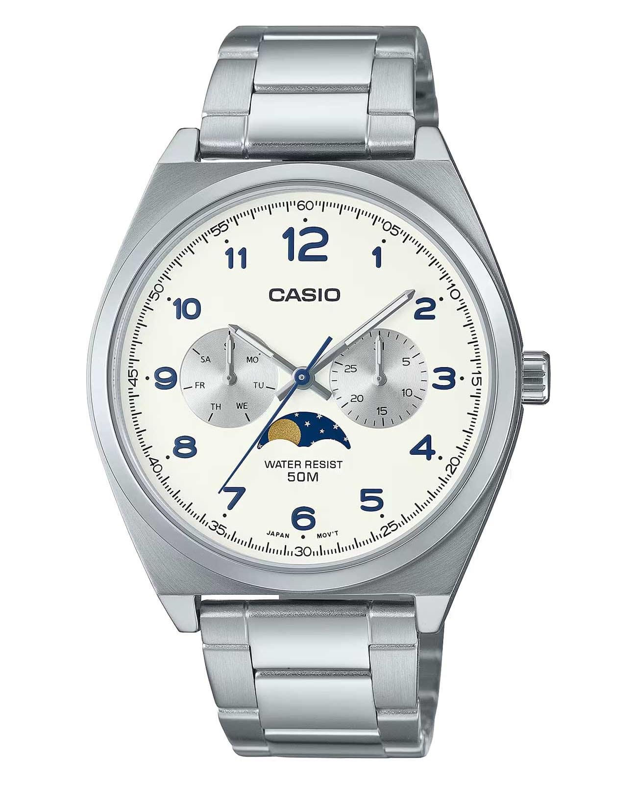 Японские мужские кварцевые часы с минеральным стекломМинеральное стеклоМинеральное стекло представляет собой искусственно выращенный минерал кварца. Такое стекло отличается особой устойчивостью к повреждениям и царапинам. Уступает по некоторым качествам сапфировому стеклу. Casio Collection MTP-M300D-7A, кварцевый механизм с высокой точностью. Корпус часов изготовлен из нержавеющей стали. Циферблат с метками в виде штрихов. Стрелки с люминесцентным покрытиемЛюминесцентное покрытиеПозволяет считывать показания времени в темноте. Производители наносят на стрелки, часовые индексы, безель или поверхность циферблата светонакопительный состав, дающий холодное свечение.. Особенностью модели является наличие индикатора фазы луны над шестью часами по циферблату. Индикатор имеет 4 положения и отображается новолуние и полнолуние, а также растущую и убывающую Луну. Батарейка рассчитана на 3 года. Класс водозащиты: 50 метров, позволит защитить корпус от случайных брызг или капель дождя. Стальной браслет на раскладной застёжкеРаскладная застёжкаТакой тип застёжки используется только на браслетах из металла. Она никогда не раскрывается полностью, происходит разделение на 2 и более частей. Раскладывающая застёжка снизит вероятность потери часов к минимуму..