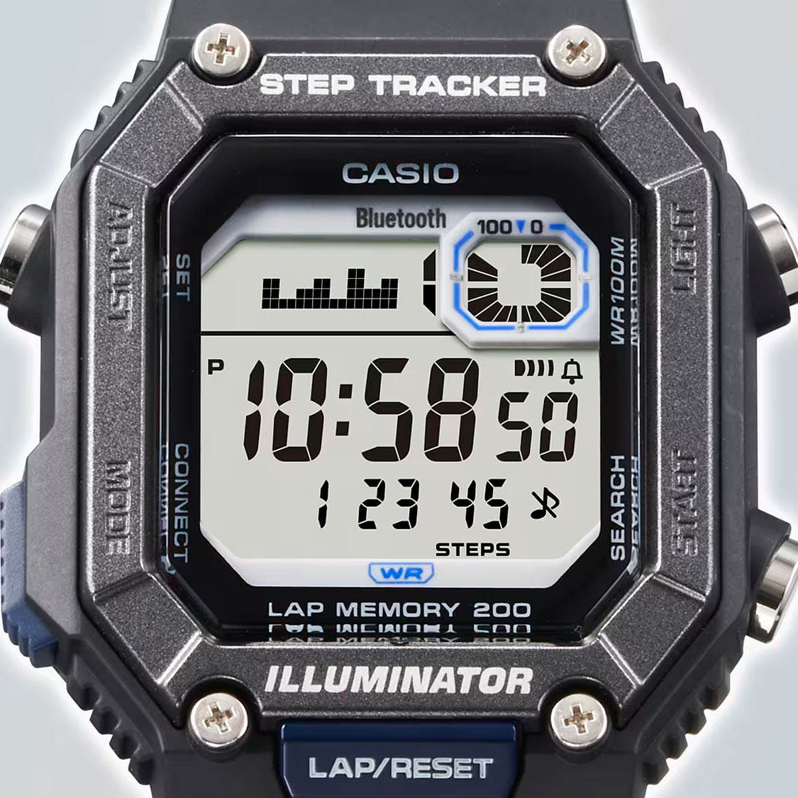 Японские мужские часы с секундомеромСекундомерСекундоме́р — прибор, способный измерять интервалы времени с точностью до долей секунды. Casio Collection WS-B1000-1AVDF (WS-B1000-1A). Корпус изготовлен из пластика. Ежедневный будильникБудильникБуди́льник — часы, в заданный момент времени подающие звуковой, световой и/или в редких случаях другой сигнал.. Ежечасный сигнал. Автоматический календарь. ТаймерТаймерОтсчитывает секунды в обратном направлении в заданном интервале времени.. Функция мирового времениМировое время Полезное часовое усложнение, отображающее время в основных городах и известных областях по всему миру, оно связано с часовыми поясами, удобно для путешественников и бизнесменов. . Функция включения/выключения звука кнопок. Класс водозащиты: 100 метров, позволит плавать, нырять и заниматься другими водными видами спорта. Ремешок из полимерного материала на стандартной застежке.