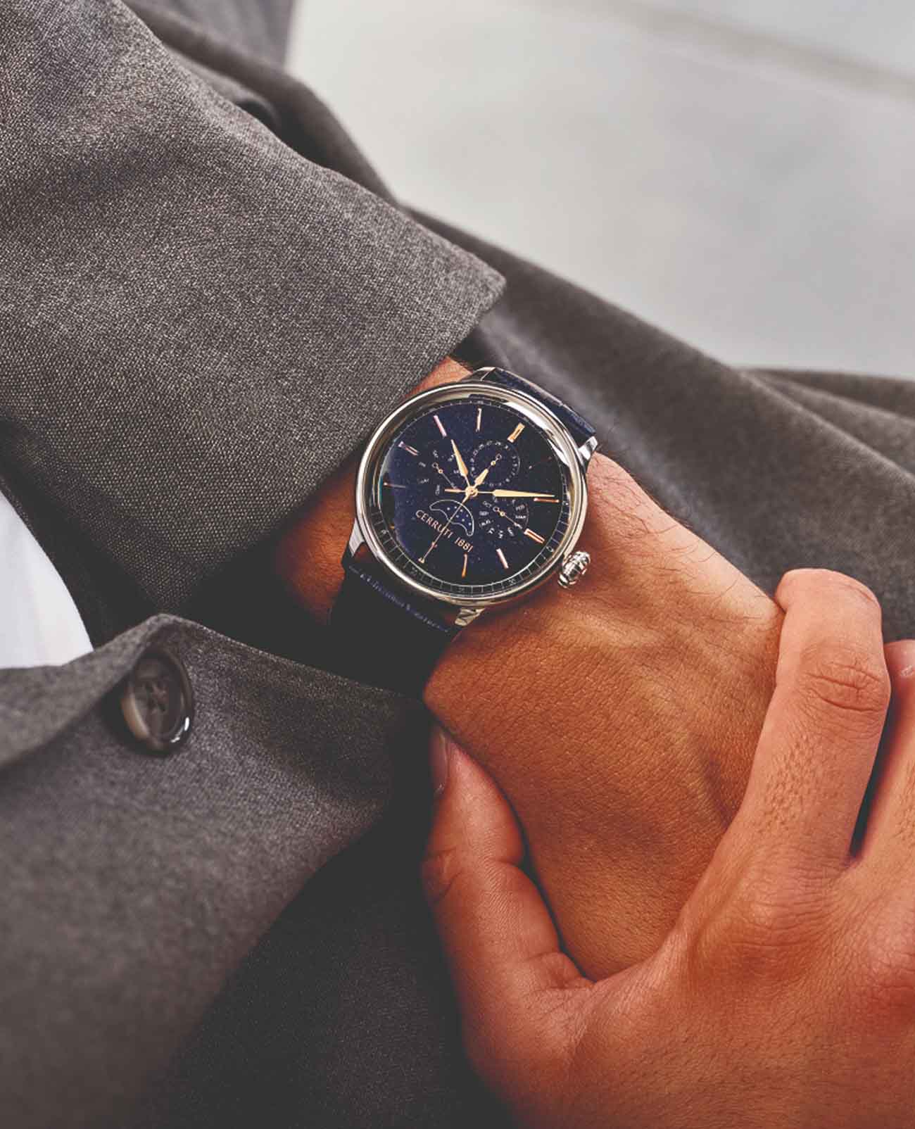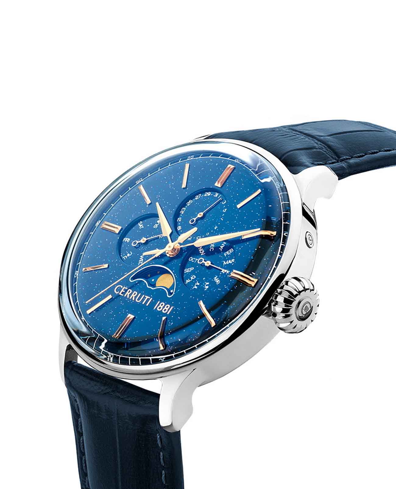 Французские мужские часы Cerruti 1881 Dervio CIWGF2224605, кварцевый механизм с высокой точностью. Минеральное стеклоМинеральное стеклоМинеральное стекло представляет собой искусственно выращенный минерал кварца. Такое стекло отличается особой устойчивостью к повреждениям и царапинам. Уступает по некоторым качествам сапфировому стеклу. устойчивое к мелким механическим повреждениям. Корпус часов изготовлен из стали. На циферблате расположены два дополнительных индикатора. Индикатор фаз луны находится в положении 6 часов. Класс водозащиты: 50 метров, позволит защитить корпус от случайных брызг или капель дождя. Кожаный ремешок на застёжке-бабочке с кнопкамиЗастёжка "бабочка"Такой вид застёжки дополняется предохранителями, помогающими избежать случайного раскрытия браслета. Обладают изящным исполнением. .