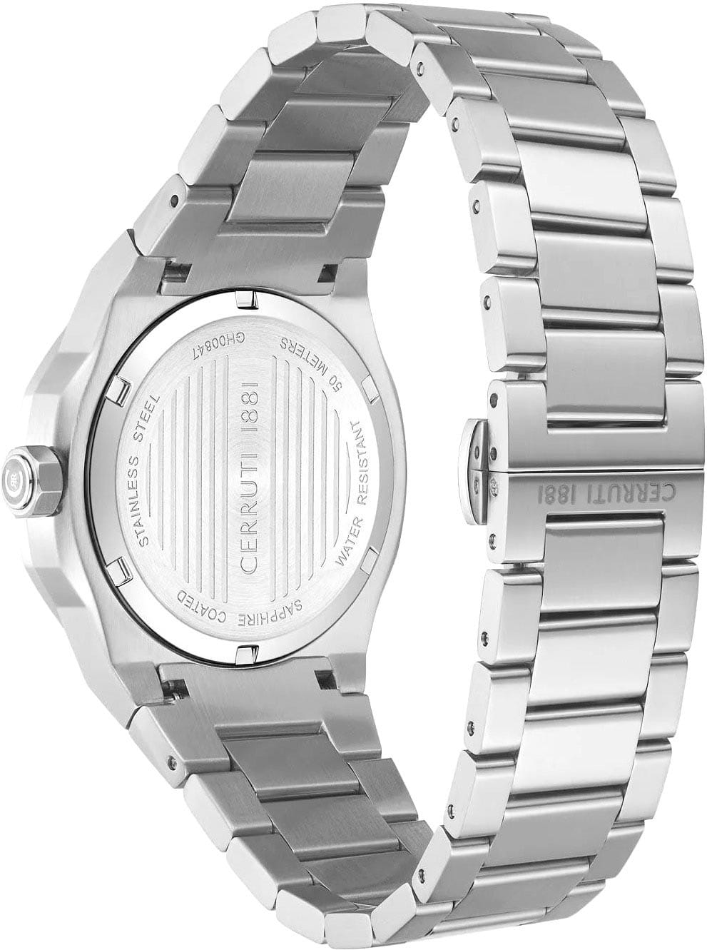 Cerruti 1881 CIWGH0084701 — утончённые мужские часы, в которых классика и современная геометрия нашли безупречный баланс. Стальной корпус с восьмигранным безелемБезельВнешний ободок, закрепляющий стекло. В спортивных часах так называется поворотное кольцо с делениями на циферблате, выполняет роль таймера – замеряет отрезки времени на шкале. Неподвижный безель – элемент декора. Однонаправленно вращающийся безель на дайверских часах позволяет фиксировать моменты погружения и выныривания на поверхность. подчёркивает архитектурную точность форм, а глубокий циферблат с гильошированным узором придаёт модели выразительную глубину. Индикаторы дня недели и даты оформлены в элегантных окнах на «12» и «3 часах», обеспечивая визуальную симметрию и удобство считывания. Прочные стрелки покрыты люминесцентным покрытиемЛюминесцентное покрытиеПозволяет считывать показания времени в темноте. Производители наносят на стрелки, часовые индексы, безель или поверхность циферблата светонакопительный состав, дающий холодное свечение., что гарантирует отличную читаемость даже в темноте. Циферблат защищён надёжным минеральным стекломМинеральное стеклоМинеральное стекло представляет собой искусственно выращенный минерал кварца. Такое стекло отличается особой устойчивостью к повреждениям и царапинам. Уступает по некоторым качествам сапфировому стеклу., устойчивым к царапинам, а стальной браслет фиксируется удобной застёжкой «бабочка»Застёжка "бабочка"Такой вид застёжки дополняется предохранителями, помогающими избежать случайного раскрытия браслета. Обладают изящным исполнением. , обеспечивающей комфорт и безопасность при носке. Строгая форма и продуманные детали делают эту модель идеальным выбором для мужчины, ценящего сдержанную роскошь и точность швейцарского стиля.