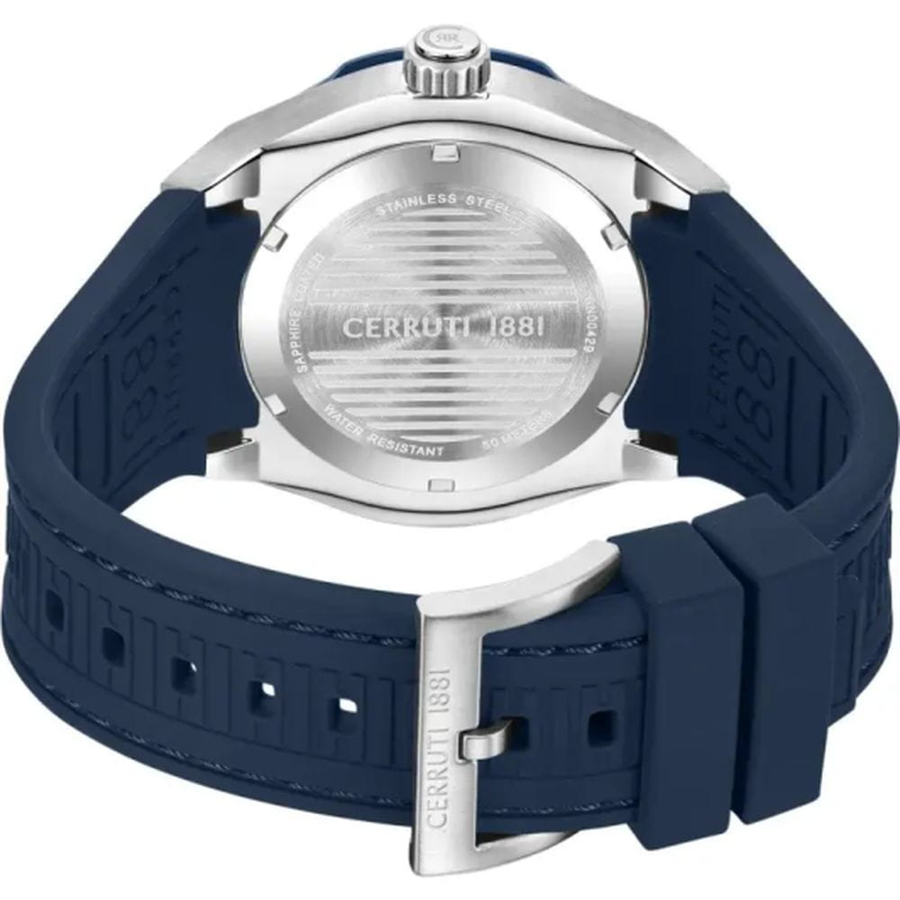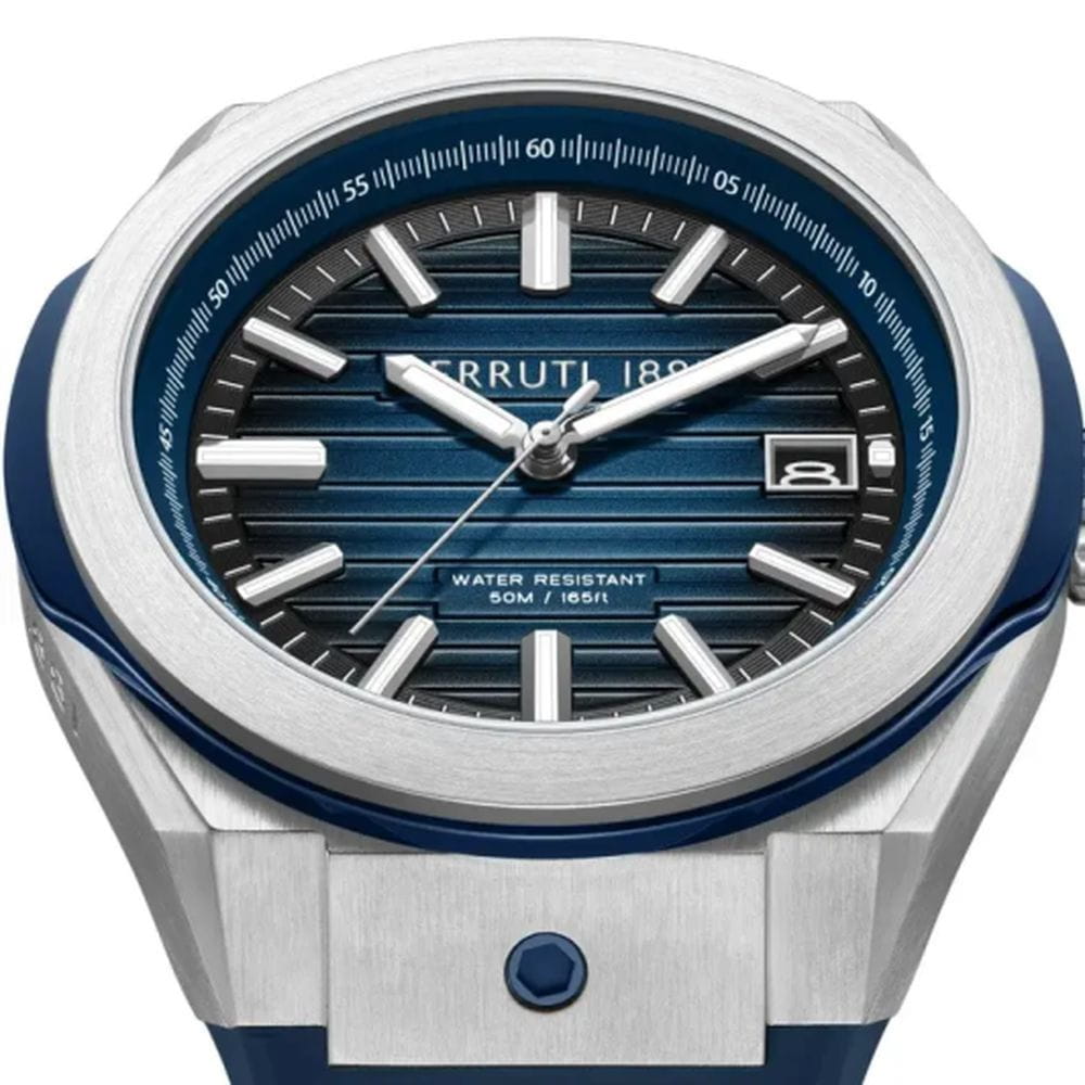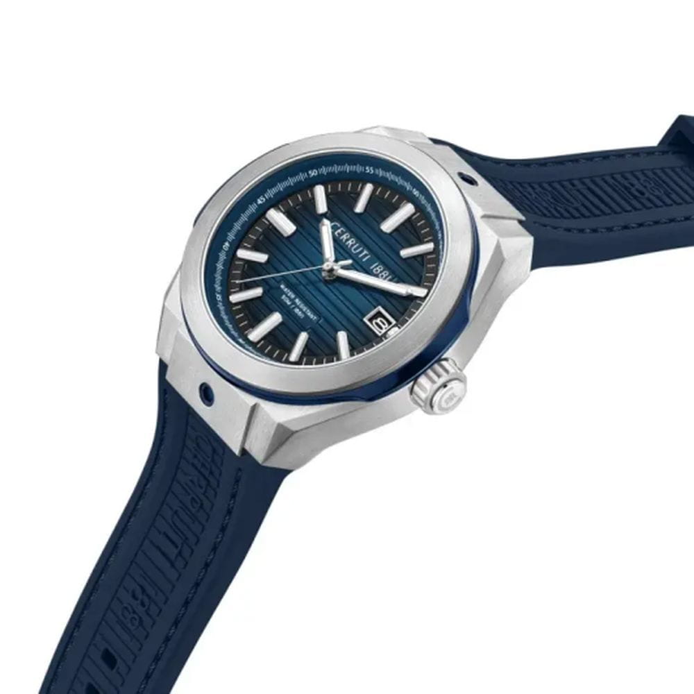 Cerruti 1881 CIWGN0042901 — выразительные мужские часы с характером, созданные в духе современной урбанистики. Массивный корпус из нержавеющей стали и геометричным безелемБезельВнешний ободок, закрепляющий стекло. В спортивных часах так называется поворотное кольцо с делениями на циферблате, выполняет роль таймера – замеряет отрезки времени на шкале. Неподвижный безель – элемент декора. Однонаправленно вращающийся безель на дайверских часах позволяет фиксировать моменты погружения и выныривания на поверхность. с частичным PVD-покрытиемPVDУльтратонкое покрытие наносится в технике вакуумного напыления, сочетает в себе нитрид титана особой прочности со слоем золота или оксида хрома. Несёт в себе декоративную или защитную функцию. подчёркивает силу и уверенность дизайна. Глубокий циферблат с горизонтальной текстурой дополняют чёткие метки и стрелки с люминесцентным покрытиемЛюминесцентное покрытиеПозволяет считывать показания времени в темноте. Производители наносят на стрелки, часовые индексы, безель или поверхность циферблата светонакопительный состав, дающий холодное свечение., обеспечивающие отличную читаемость даже в сумерках. Функциональное оформление включает окно даты на позиции «3 часов», подчёркивающую практичный характер модели. Прочное минеральное стеклоМинеральное стеклоМинеральное стекло представляет собой искусственно выращенный минерал кварца. Такое стекло отличается особой устойчивостью к повреждениям и царапинам. Уступает по некоторым качествам сапфировому стеклу. защищает циферблат, а эластичный силиконовый ремешок в тон циферблату обеспечивает комфорт и современный спортивный акцент. Cerruti 1881 — стильный аксессуар для мужчин, ценящих надёжность, функциональность и безупречное чувство стиля.