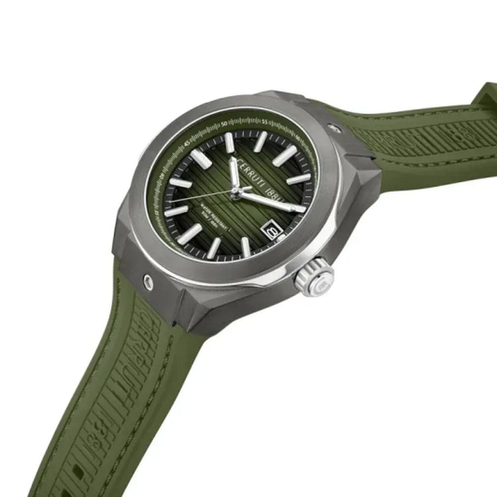 Cerruti 1881 CIWGN0042902 — выразительные мужские часы с характером, созданные в духе современной урбанистики. Массивный корпус из нержавеющей стали с серым матовым PVD-покрытиемPVDУльтратонкое покрытие наносится в технике вакуумного напыления, сочетает в себе нитрид титана особой прочности со слоем золота или оксида хрома. Несёт в себе декоративную или защитную функцию. и геометричным безелемБезельВнешний ободок, закрепляющий стекло. В спортивных часах так называется поворотное кольцо с делениями на циферблате, выполняет роль таймера – замеряет отрезки времени на шкале. Неподвижный безель – элемент декора. Однонаправленно вращающийся безель на дайверских часах позволяет фиксировать моменты погружения и выныривания на поверхность. подчёркивает силу и уверенность дизайна. Глубокий зелёный циферблат с горизонтальной текстурой дополняют чёткие метки и стрелки с люминесцентным покрытиемЛюминесцентное покрытиеПозволяет считывать показания времени в темноте. Производители наносят на стрелки, часовые индексы, безель или поверхность циферблата светонакопительный состав, дающий холодное свечение., обеспечивающие отличную читаемость даже в сумерках. Функциональное оформление включает окно даты на позиции «3 часов», подчёркивающую практичный характер модели. Прочное минеральное стеклоМинеральное стеклоМинеральное стекло представляет собой искусственно выращенный минерал кварца. Такое стекло отличается особой устойчивостью к повреждениям и царапинам. Уступает по некоторым качествам сапфировому стеклу. защищает циферблат, а эластичный силиконовый ремешок в тон циферблату обеспечивает комфорт и современный спортивный акцент. Cerruti 1881 — стильный аксессуар для мужчин, ценящих надёжность, функциональность и безупречное чувство стиля.