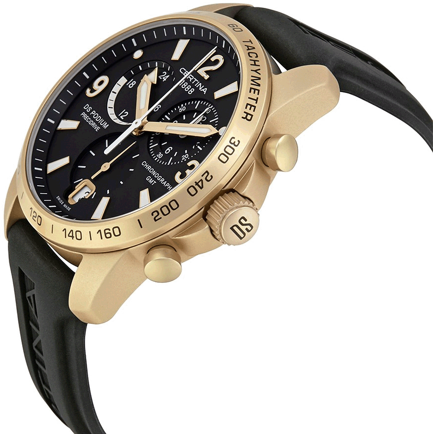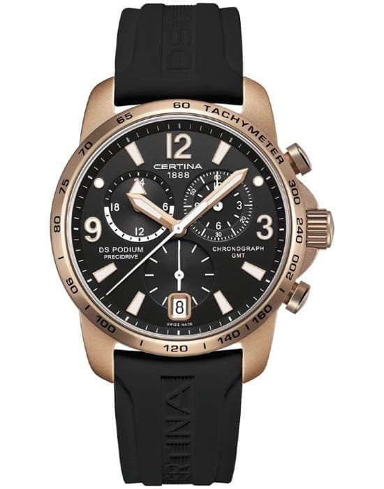 Каучуковый ремешок обеспечивает комфортное ношение. Швейцарский кварцевый механизм G10.962 BF Precidrive™Precidrive™Инновационный кварцевый механизм Certina. Часы, оснащённые этим швейцарским калибром, приравниваются к точности к сертифицированным хронометрам, точность хода составляет +/-10 секунд в год. отличается высокой точностью хода. Ультралёгкий алюминиевый корпус. Сапфировое стекло. ХронографХронографФункция позволяет измерять отрезки времени с особой точностью: часы, минуты, секунды. Верным признаком хронографа является наличие на циферблате 3 дополнительных окошек-счётчиков., календарь, GMTGMTОтображение времени второго часового пояса.Такая функция особенно актуальна для путешественников и бизнесменов,которые общаются с людьми из разных стран,теперь вы всегда будете знать,какой час у вашего партнёра или близкого человека., секундомер, тахиметрТахиметрРазмеченная шкала, располагается на ободке или безеле часов. Тахиметр позволяет рассчитать скорость на определённом участке пути, расстояние измеряется в километрах или милях..