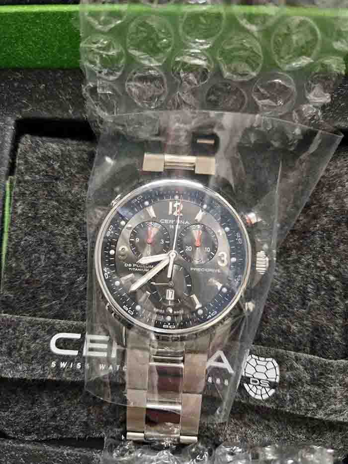 Наручные часы станут превосходным дополнением для образа, такой аксессуар выбирают успешные и уверенные в себе мужчины. Модель в серебристом цвете с красными элементами оформления выполнена из титана. Для материала характерны антикоррозионные свойства, устойчивость к магнитным полям и морской воде. Абсолютная точность хода обеспечивается благодаря швейцарскому кварцевому калибру ETA 251.264 Precidrive™Precidrive™Инновационный кварцевый механизм Certina. Часы, оснащённые этим швейцарским калибром, приравниваются к точности к сертифицированным хронометрам, точность хода составляет +/-10 секунд в год.. Ударопрочность и водонепроницаемость 200 метров - реализация технологии DS ConceptDS ConceptDouble Security Concept, обозначает двойную надёжность и безупречную точность часов Certina. Двойная система защиты подразумевает обеспечение максимальной устойчивости к ударам и высоких показателей водонепроницаемости.. Закручивающиеся заводная головка и задняя крышка. Стекло из сапфира с двухсторонним антибликовым покрытием. БезельБезельВнешний ободок, закрепляющий стекло. В спортивных часах так называется поворотное кольцо с делениями на циферблате, выполняет роль таймера – замеряет отрезки времени на шкале. Неподвижный безель – элемент декора. Однонаправленно вращающийся безель на дайверских часах позволяет фиксировать моменты погружения и выныривания на поверхность. со шкалой тахиметраТахиметрРазмеченная шкала, располагается на ободке или безеле часов. Тахиметр позволяет рассчитать скорость на определённом участке пути, расстояние измеряется в километрах или милях.. Секундомер 1/100 секунды, дата. Индикатор EOLEOLПредставляет собой систему, уведомляющую владельца часов о необходимости замены элемента питания. За 2 недели до полного разряда батарейки секундная стрелка перестаёт ходить чётко и начинает перепрыгивать на 3-4 деления.. Диаметр корпуса: 44 мм.