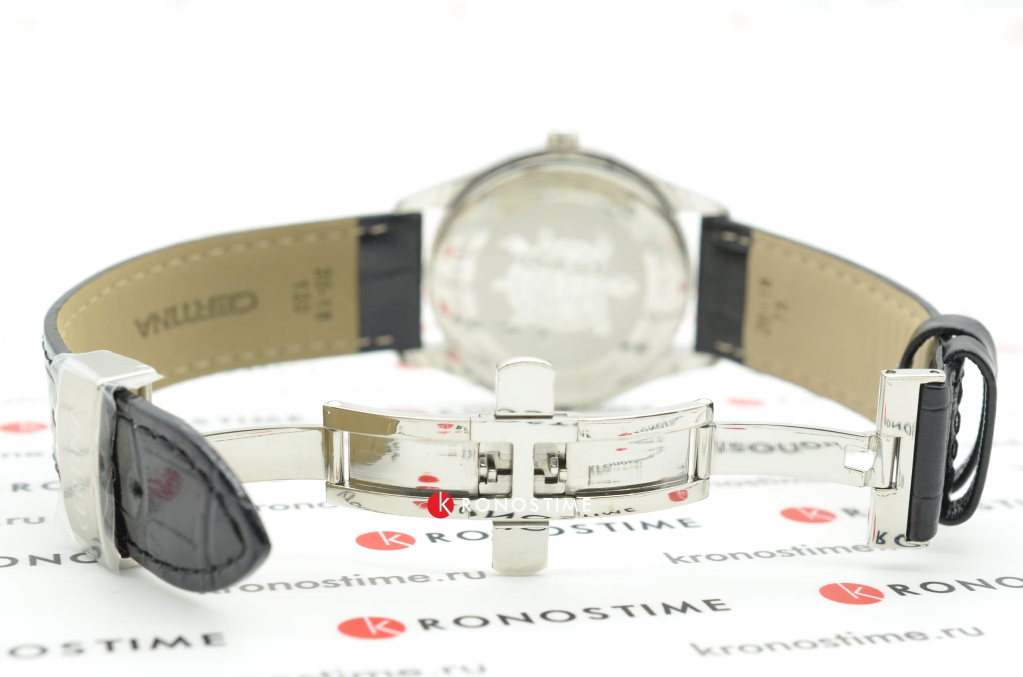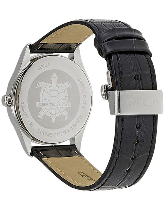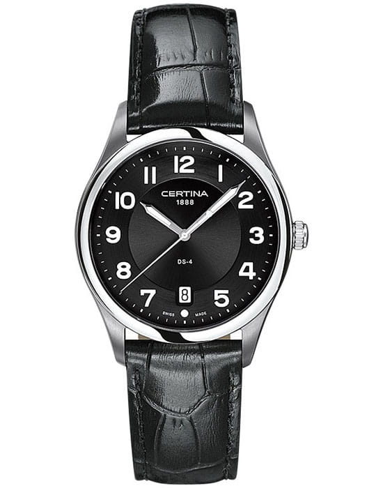 Классический циферблат чёрного цвета дополнен серебристыми стрелками, метками и арабскими цифрами, ярко выделяющимися на тёмном фоне. Ремешок из натуральной кожи с тиснением, имитирующим кожу крокодила, позволит привнести в образ нотки элегантности. Кварцевый калибр ETA E64.111. Антибликовое покрытие сапфирового стекла. Надёжный корпус из нержавеющей стали 316L. Яркая люминесцентная подсветкаЛюминесцентное покрытиеПозволяет считывать показания времени в темноте. Производители наносят на стрелки, часовые индексы, безель или поверхность циферблата светонакопительный состав, дающий холодное свечение.. Концепция ударопрочности DS Concept DS ConceptDouble Security Concept, обозначает двойную надёжность и безупречную точность часов Certina. Двойная система защиты подразумевает обеспечение максимальной устойчивости к ударам и высоких показателей водонепроницаемости.. Водостойкость 100 метров. Апертура даты, индикатор EOLEOLПредставляет собой систему, уведомляющую владельца часов о необходимости замены элемента питания. За 2 недели до полного разряда батарейки секундная стрелка перестаёт ходить чётко и начинает перепрыгивать на 3-4 деления.. Диаметр корпуса: 37 мм.