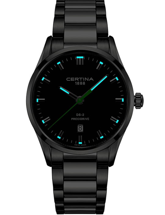 Наручные часы не имеют лишних деталей, всё выглядит строго и лаконично. Яркой деталью является зелёная секундная стрелка, облегчающая читаемость данных. За высокую точность хода в ответе швейцарский кварцевый механизм ETA F06.411Precidrive™Precidrive™Инновационный кварцевый механизм Certina. Часы, оснащённые этим швейцарским калибром, приравниваются к точности к сертифицированным хронометрам, точность хода составляет +/-10 секунд в год.. Корпус и браслет изготовлены из стали 316L с антикоррозионными свойствами. Концепция Двойной Надёжности Double SecurityDS ConceptDouble Security Concept, обозначает двойную надёжность и безупречную точность часов Certina. Двойная система защиты подразумевает обеспечение максимальной устойчивости к ударам и высоких показателей водонепроницаемости.. Сапфировое стекло с односторонним покрытием «антиблик». Водостойкость 100 метров. Люминесцентная подсветкаЛюминесцентное покрытиеПозволяет считывать показания времени в темноте. Производители наносят на стрелки, часовые индексы, безель или поверхность циферблата светонакопительный состав, дающий холодное свечение.. Стальная . Окошко текущего числа, функция EOLEOLПредставляет собой систему, уведомляющую владельца часов о необходимости замены элемента питания. За 2 недели до полного разряда батарейки секундная стрелка перестаёт ходить чётко и начинает перепрыгивать на 3-4 деления.. Диаметр корпуса: 40 мм.