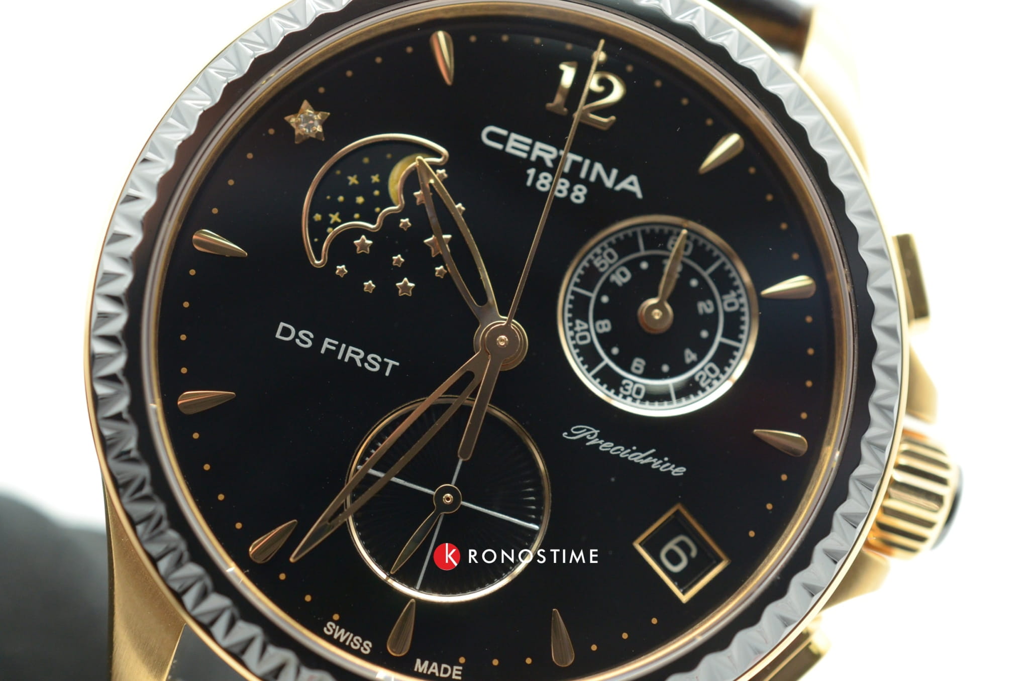 Женские швейцарские часы Certina DS First Lady Chronograph Moon Phase C030.250.36.056.00 из коллекции DS First привлекают эксклюзивным дизайном. Окошко в положении 10 часов отображает лунные фазы, стильно смотрится бриллиантовая звезда. Кварцевый швейцарский механизм G10.962 Precidrive™. Керамический безель с гранёным краем. Чёрный кожаный ремешок. EOL, календарь, хронограф. Производство и сборка: Швейцария.
