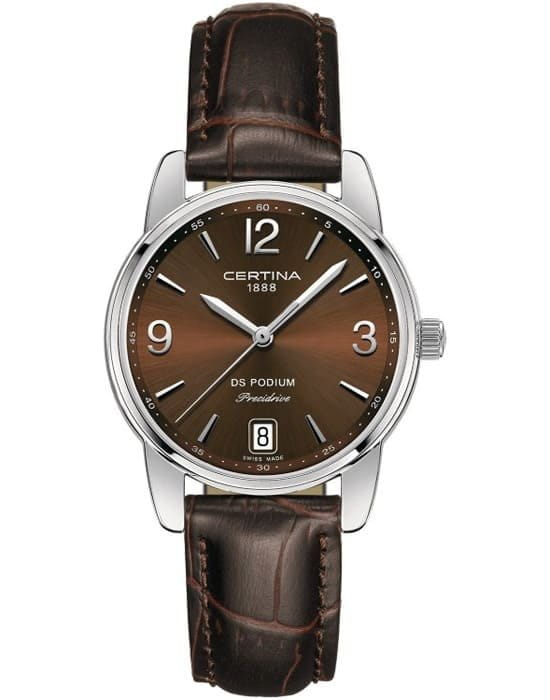 Модель обладает изысканной формой корпуса с утончёнными линиями, что делает её ещё более привлекательной. Аксессуар незаменим для ношения каждый день, кварцевый швейцарский калибр ETA F06.411 Precidrive™Precidrive™Инновационный кварцевый механизм Certina. Часы, оснащённые этим швейцарским калибром, приравниваются к точности к сертифицированным хронометрам, точность хода составляет +/-10 секунд в год. измеряет время с особой точностью и никогда не позволит вам опоздать на важную встречу. Система DS ConceptDS ConceptDouble Security Concept, обозначает двойную надёжность и безупречную точность часов Certina. Двойная система защиты подразумевает обеспечение максимальной устойчивости к ударам и высоких показателей водонепроницаемости.. Одностороннее антибликовое покрытие стекла из сапфира. Степень водонепроницаемости WR 100. Ремешок из натуральной кожи. . Календарь, функция EOLEOLПредставляет собой систему, уведомляющую владельца часов о необходимости замены элемента питания. За 2 недели до полного разряда батарейки секундная стрелка перестаёт ходить чётко и начинает перепрыгивать на 3-4 деления.. Диаметр корпуса: 33 мм.