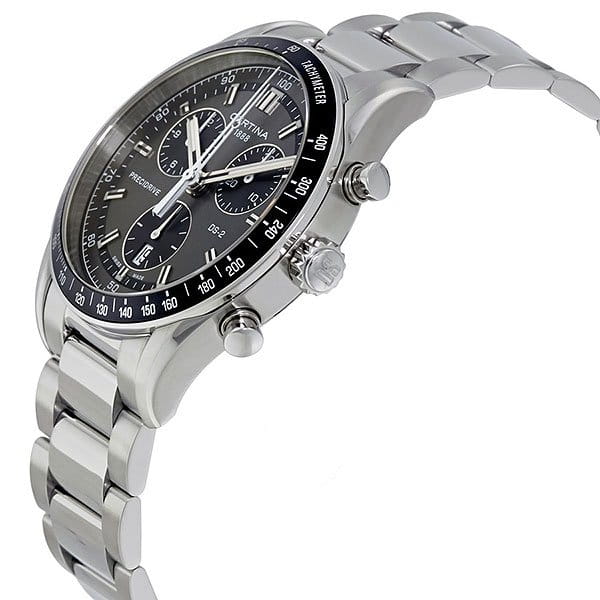 Брендовый аксессуар сразу притягивает внимание. Чёрный циферблат, дополненный контрастными элементами и функциональными окошками, отражает спортивную динамичность. Алюминиевый безельБезельВнешний ободок, закрепляющий стекло. В спортивных часах так называется поворотное кольцо с делениями на циферблате, выполняет роль таймера – замеряет отрезки времени на шкале. Неподвижный безель – элемент декора. Однонаправленно вращающийся безель на дайверских часах позволяет фиксировать моменты погружения и выныривания на поверхность. размечен шкалой тахиметраТахиметрРазмеченная шкала, располагается на ободке или безеле часов. Тахиметр позволяет рассчитать скорость на определённом участке пути, расстояние измеряется в километрах или милях.. Часы основаны на концепции Double SecurityDS ConceptDouble Security Concept, обозначает двойную надёжность и безупречную точность часов Certina. Двойная система защиты подразумевает обеспечение максимальной устойчивости к ударам и высоких показателей водонепроницаемости., что свидетельствует о высокой устойчивости к ударам и водонепроницаемости (до 10 бар) модели. Швейцарский кварцевый калибр ETA 251.264 Precidrive™Precidrive™Инновационный кварцевый механизм Certina. Часы, оснащённые этим швейцарским калибром, приравниваются к точности к сертифицированным хронометрам, точность хода составляет +/-10 секунд в год., измеряющий время с точностью до одной сотой секунды. Двухстороннее антибликовое покрытие для стекла из сапфира. Корпус и браслет из стали 316L с антикоррозионными свойствами. Задняя крышка с фирменной гравировкой. ХронографХронографФункция позволяет измерять отрезки времени с особой точностью: часы, минуты, секунды. Верным признаком хронографа является наличие на циферблате 3 дополнительных окошек-счётчиков., календарь, индикатор EOLEOLПредставляет собой систему, уведомляющую владельца часов о необходимости замены элемента питания. За 2 недели до полного разряда батарейки секундная стрелка перестаёт ходить чётко и начинает перепрыгивать на 3-4 деления., секундомер. Диаметр корпуса: 41 мм.