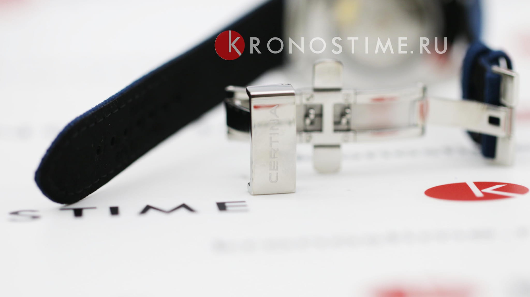 Брендовая модель имеет синий циферблат с контрастными стрелками и часовой разметкой, что обеспечивает хорошую читаемость показателей в любых условиях. Тканевый ремешок надёжно обхватывает запястье, а застёжка «бабочка» с кнопкамиЗастёжка "бабочка"Такой вид застёжки дополняется предохранителями, помогающими избежать случайного раскрытия браслета. Обладают изящным исполнением. предотвращает случайное расстёгивание. Часы работают за счёт швейцарского пружинного механизма ETA Powermatic 80Powermatic 80Эксклюзивный калибр от швейцарской компании ETA с увеличенным запасом хода до 80 часов за счёт удлинённой заводной пружины. Характеризуется улучшенной системой спуска со сниженным трением., его запас хода увеличен до 80 часов. Соблюдение DS ConceptDS ConceptDouble Security Concept, обозначает двойную надёжность и безупречную точность часов Certina. Двойная система защиты подразумевает обеспечение максимальной устойчивости к ударам и высоких показателей водонепроницаемости.. Корпус из нержавеющей стали 316L. Сапфировое стеклоСапфировое стеклоПрочный и надёжный материал из кристалла сапфира синтетического происхождения, характеризующийся особой твёрдостью и устойчивостью к царапинам и повреждениям. с покрытием «антиблик». Водостойкость 200 метров. Люминисцентное покрытиеЛюминесцентное покрытиеПозволяет считывать показания времени в темноте. Производители наносят на стрелки, часовые индексы, безель или поверхность циферблата светонакопительный состав, дающий холодное свечение. SuperLumiNova. Завинчивающаяся задняя крышка. Защищённая заводная головка. Календарь с индикацией числа и дня недели. Диаметр корпуса: 41 мм.
