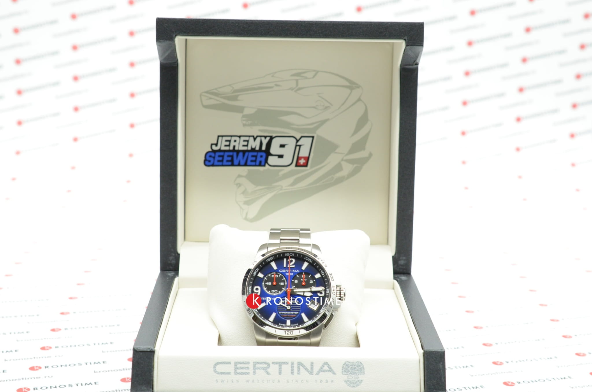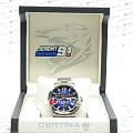 Наручные часы в спортивном стиле привлекают внимание синими деталями, что символизирует скоростное напряжение на гоночной трассе. Отличным дополнением стал браслет из нержавеющей стали. Кварцевый швейцарский механизм ETA G10.212 Precidrive™Precidrive™Инновационный кварцевый механизм Certina. Часы, оснащённые этим швейцарским калибром, приравниваются к точности к сертифицированным хронометрам, точность хода составляет +/-10 секунд в год. с повышенной точностью хода, подтверждённой сертификатом COSCСертификат COSCОфициальный сертификат, подтверждающий то, что часы ходят с особо высокой точностью. Для получения документа часы подвергаются тестовым испытаниям, разработанным швейцарским институтом тестирования хронометров COSC. Допустимая норма для механических часов -4/+6 секунд в день, для кварцевых моделей +/- 0,07 секунд в день.. Система DS ConceptDS ConceptDouble Security Concept, обозначает двойную надёжность и безупречную точность часов Certina. Двойная система защиты подразумевает обеспечение максимальной устойчивости к ударам и высоких показателей водонепроницаемости.. Двухстороннее антибликовое покрытие для стекла из сапфира. Стрелки и индексы с составом SuperLumiNovaЛюминесцентное покрытиеПозволяет считывать показания времени в темноте. Производители наносят на стрелки, часовые индексы, безель или поверхность циферблата светонакопительный состав, дающий холодное свечение.. Заводная головка с защитой. ХронографХронографФункция позволяет измерять отрезки времени с особой точностью: часы, минуты, секунды. Верным признаком хронографа является наличие на циферблате 3 дополнительных окошек-счётчиков., шкала тахиметраТахиметрРазмеченная шкала, располагается на ободке или безеле часов. Тахиметр позволяет рассчитать скорость на определённом участке пути, расстояние измеряется в километрах или милях., календарь, секундомер, индикатор EOLEOLПредставляет собой систему, уведомляющую владельца часов о необходимости замены элемента питания. За 2 недели до полного разряда батарейки секундная стрелка перестаёт ходить чётко и начинает перепрыгивать на 3-4 деления., Lap-функция измерения промежуточного времени (круга). Диаметр корпуса: 42 мм.