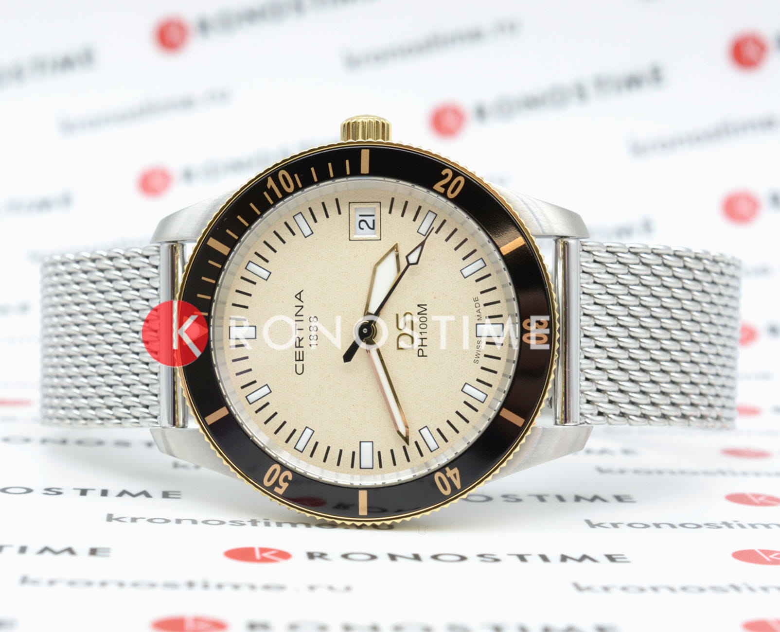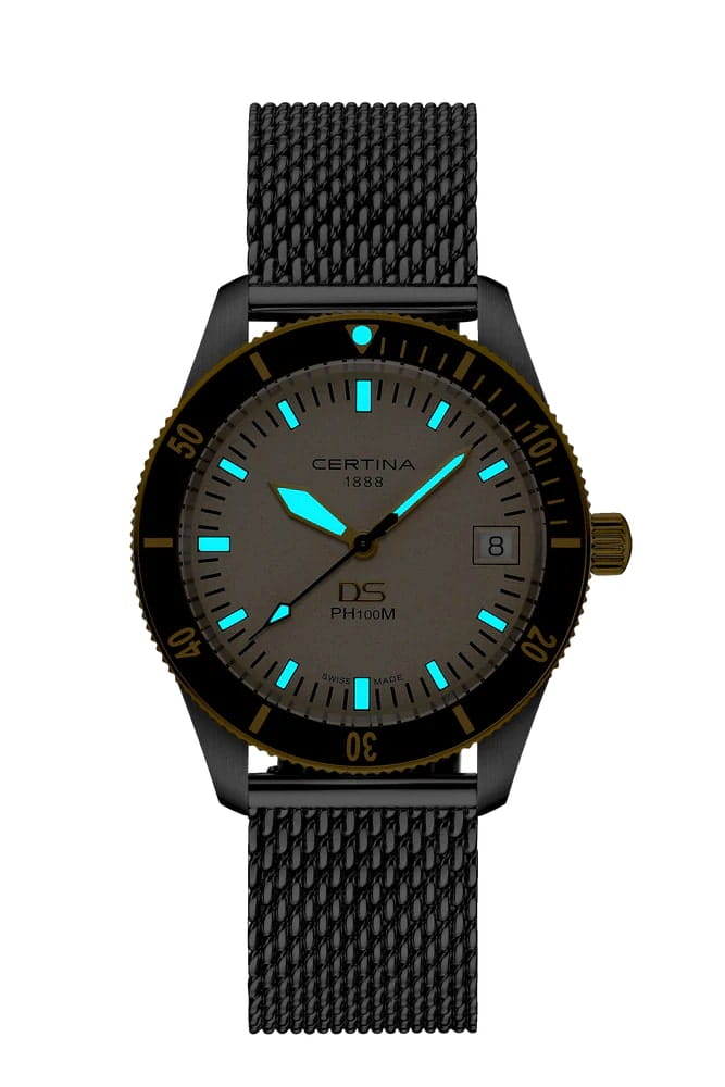 Certina DS PH100M Gent C044.410.21.030.00– часы для поклонников ярких аксессуаров. Корпус изготовлен из высококачественной нержавеющей стали 316L с . Под твердым сапфировым стекломСапфировое стеклоПрочный и надёжный материал из кристалла сапфира синтетического происхождения, характеризующийся особой твёрдостью и устойчивостью к царапинам и повреждениям. с антибликовым покрытиемАнтибликовое покрытиеСлой оксида металла в 0,13-0,3 микрон, благодаря которому стекло часов не бликует и не отражает свет. Антибликовое покрытие уменьшает отражение света в 10 раз, обеспечивая отличную читаемость показателей циферблата. находится бежевый циферблат на котором вы найдете окошко даты в положении 3 часа, а также маркировку, покрытую люминесцентным покрытиемЛюминесцентное покрытиеПозволяет считывать показания времени в темноте. Производители наносят на стрелки, часовые индексы, безель или поверхность циферблата светонакопительный состав, дающий холодное свечение. Super-LumiNova. Класс водозащиты: 100 метров, позволит плавать, нырять и заниматься другими водными видами спорта. Стальной ремешок миланского плетения на застёжке-бабочке с кнопкамиЗастёжка "бабочка"Такой вид застёжки дополняется предохранителями, помогающими избежать случайного раскрытия браслета. Обладают изящным исполнением. . БезельБезельВнешний ободок, закрепляющий стекло. В спортивных часах так называется поворотное кольцо с делениями на циферблате, выполняет роль таймера – замеряет отрезки времени на шкале. Неподвижный безель – элемент декора. Однонаправленно вращающийся безель на дайверских часах позволяет фиксировать моменты погружения и выныривания на поверхность. из нержавеющей стали с PVD-покрытиемPVDУльтратонкое покрытие наносится в технике вакуумного напыления, сочетает в себе нитрид титана особой прочности со слоем золота или оксида хрома. Несёт в себе декоративную или защитную функцию.