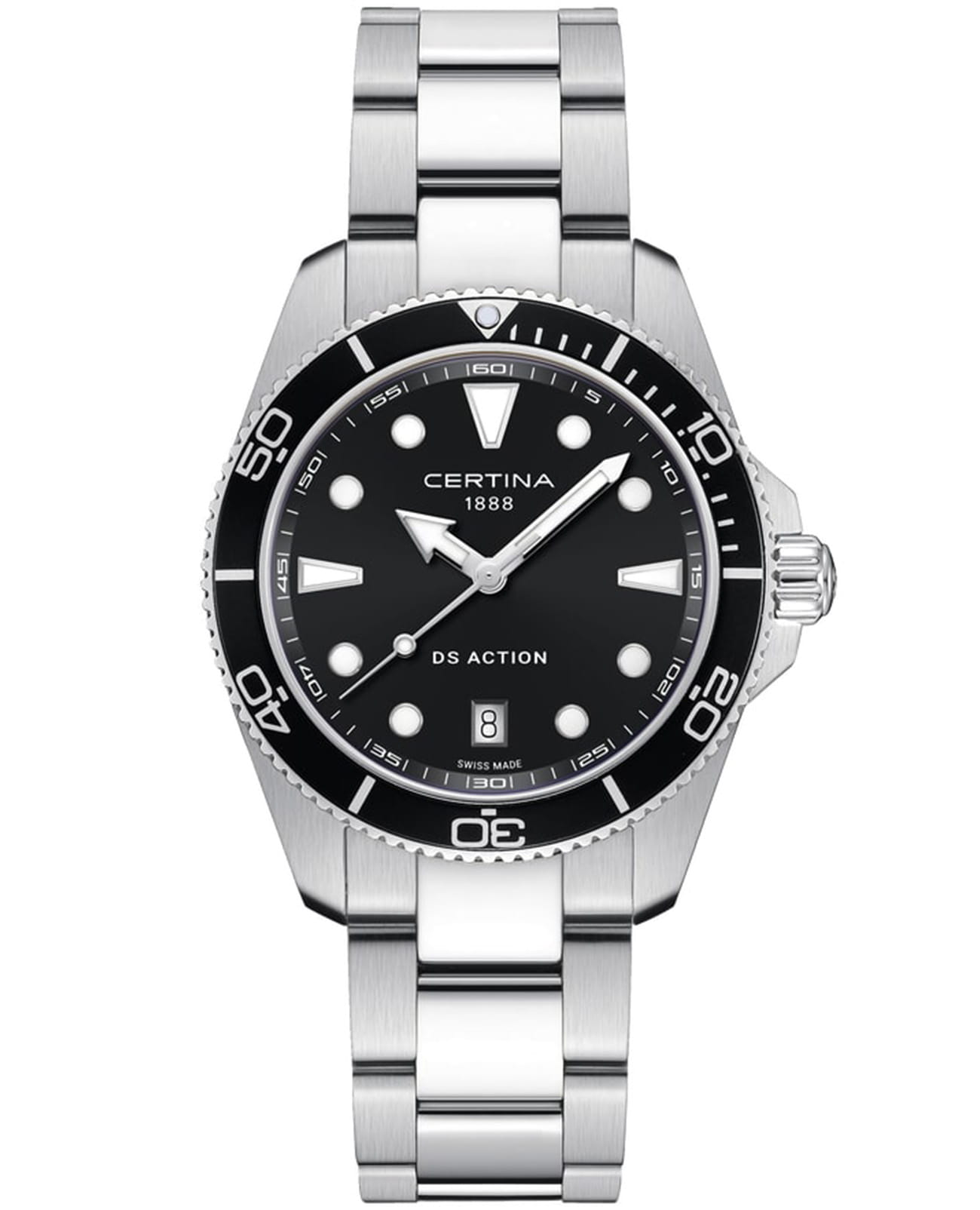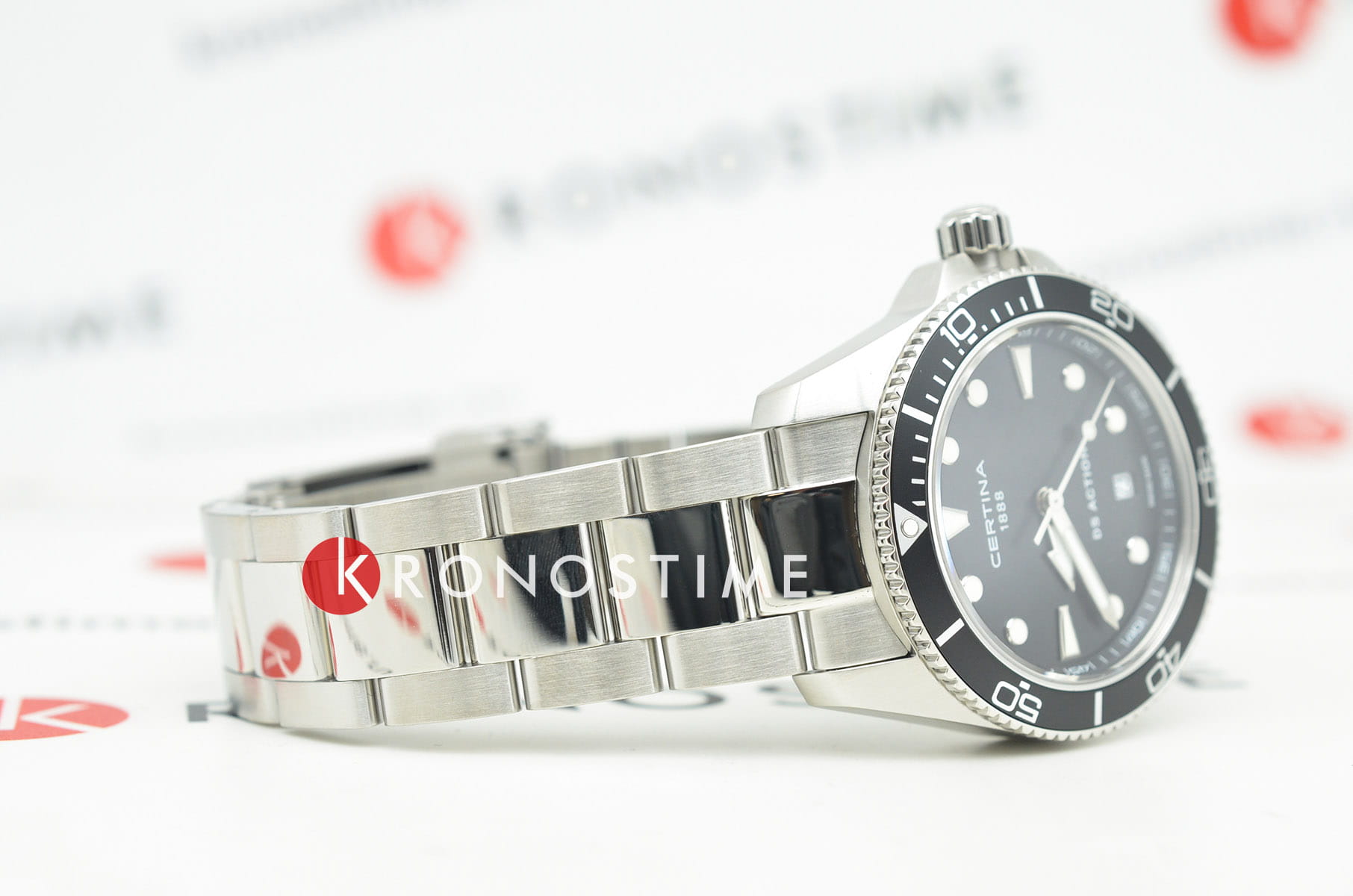 Certina DS Action C048.410.11.051.00 – элегантные мужские часы, сочетающие современный дизайн и высокую функциональность. Корпус диаметром 40 мм выполнен из нержавеющей стали 316L, обеспечивающей прочность и долговечность. Чёрный циферблат с метками и стрелками, покрытыми люминесцентным покрытиемЛюминесцентное покрытиеПозволяет считывать показания времени в темноте. Производители наносят на стрелки, часовые индексы, безель или поверхность циферблата светонакопительный состав, дающий холодное свечение., обеспечивает отличную читаемость в любых условиях, а его поверхность защищена сапфировым стекломСапфировое стеклоПрочный и надёжный материал из кристалла сапфира синтетического происхождения, характеризующийся особой твёрдостью и устойчивостью к царапинам и повреждениям. с антибликовым покрытиемАнтибликовое покрытиеСлой оксида металла в 0,13-0,3 микрон, благодаря которому стекло часов не бликует и не отражает свет. Антибликовое покрытие уменьшает отражение света в 10 раз, обеспечивая отличную читаемость показателей циферблата., устойчивым к царапинам.БезельБезельВнешний ободок, закрепляющий стекло. В спортивных часах так называется поворотное кольцо с делениями на циферблате, выполняет роль таймера – замеряет отрезки времени на шкале. Неподвижный безель – элемент декора. Однонаправленно вращающийся безель на дайверских часах позволяет фиксировать моменты погружения и выныривания на поверхность. с PVD-покрытиемPVDУльтратонкое покрытие наносится в технике вакуумного напыления, сочетает в себе нитрид титана особой прочности со слоем золота или оксида хрома. Несёт в себе декоративную или защитную функцию.. Часы оснащены швейцарским кварцевым механизмом ETA F06.412 с технологией Precidrive™Precidrive™Инновационный кварцевый механизм Certina. Часы, оснащённые этим швейцарским калибром, приравниваются к точности к сертифицированным хронометрам, точность хода составляет +/-10 секунд в год., обеспечивающей исключительную точность хода. Функция EOLEOLПредставляет собой систему, уведомляющую владельца часов о необходимости замены элемента питания. За 2 недели до полного разряда батарейки секундная стрелка перестаёт ходить чётко и начинает перепрыгивать на 3-4 деления. (индикатор окончания заряда батареи) предупреждает о необходимости замены элемента питания. Браслет из нержавеющей стали 316L оснащён системой быстрой замены, позволяющей легко адаптировать стиль часов. Водонепроницаемость 300 метров (30 бар) делает модель идеальным выбором для плавания и дайвинга.