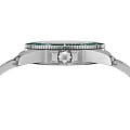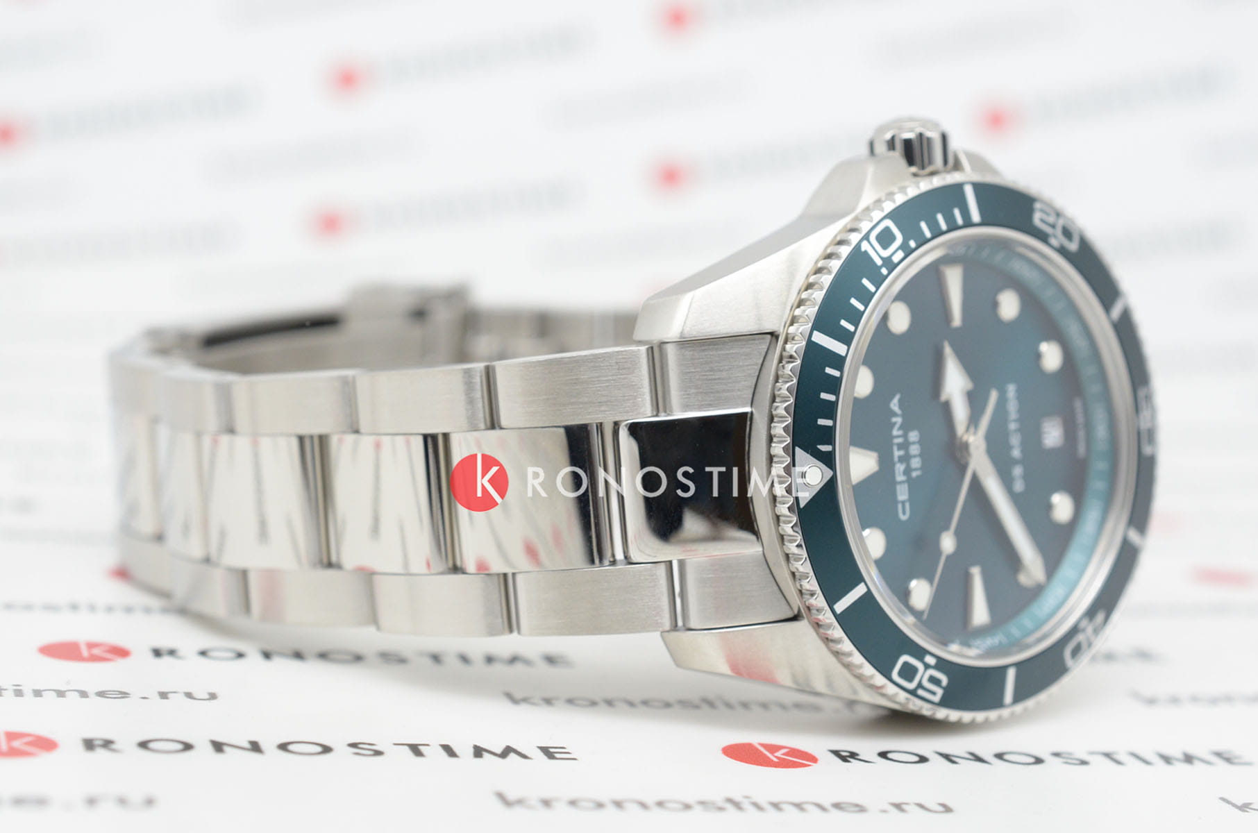 Certina DS Action C048.410.11.091.00 – элегантные мужские часы, сочетающие современный дизайн и высокую функциональность. Корпус диаметром 40 мм выполнен из нержавеющей стали 316L, обеспечивающей прочность и долговечность. Зелёный циферблат с метками и стрелками, покрытыми люминесцентным покрытиемЛюминесцентное покрытиеПозволяет считывать показания времени в темноте. Производители наносят на стрелки, часовые индексы, безель или поверхность циферблата светонакопительный состав, дающий холодное свечение., обеспечивает отличную читаемость в любых условиях, а его поверхность защищена сапфировым стекломСапфировое стеклоПрочный и надёжный материал из кристалла сапфира синтетического происхождения, характеризующийся особой твёрдостью и устойчивостью к царапинам и повреждениям. с антибликовым покрытиемАнтибликовое покрытиеСлой оксида металла в 0,13-0,3 микрон, благодаря которому стекло часов не бликует и не отражает свет. Антибликовое покрытие уменьшает отражение света в 10 раз, обеспечивая отличную читаемость показателей циферблата., устойчивым к царапинам.БезельБезельВнешний ободок, закрепляющий стекло. В спортивных часах так называется поворотное кольцо с делениями на циферблате, выполняет роль таймера – замеряет отрезки времени на шкале. Неподвижный безель – элемент декора. Однонаправленно вращающийся безель на дайверских часах позволяет фиксировать моменты погружения и выныривания на поверхность. с PVD-покрытиемPVDУльтратонкое покрытие наносится в технике вакуумного напыления, сочетает в себе нитрид титана особой прочности со слоем золота или оксида хрома. Несёт в себе декоративную или защитную функцию.. Часы оснащены швейцарским кварцевым механизмом ETA F06.412 с технологией Precidrive™Precidrive™Инновационный кварцевый механизм Certina. Часы, оснащённые этим швейцарским калибром, приравниваются к точности к сертифицированным хронометрам, точность хода составляет +/-10 секунд в год., обеспечивающей исключительную точность хода. Функция EOLEOLПредставляет собой систему, уведомляющую владельца часов о необходимости замены элемента питания. За 2 недели до полного разряда батарейки секундная стрелка перестаёт ходить чётко и начинает перепрыгивать на 3-4 деления. (индикатор окончания заряда батареи) предупреждает о необходимости замены элемента питания. Браслет из нержавеющей стали 316L оснащён системой быстрой замены, позволяющей легко адаптировать стиль часов. Водонепроницаемость 300 метров (30 бар) делает модель идеальным выбором для плавания и дайвинга.
