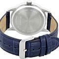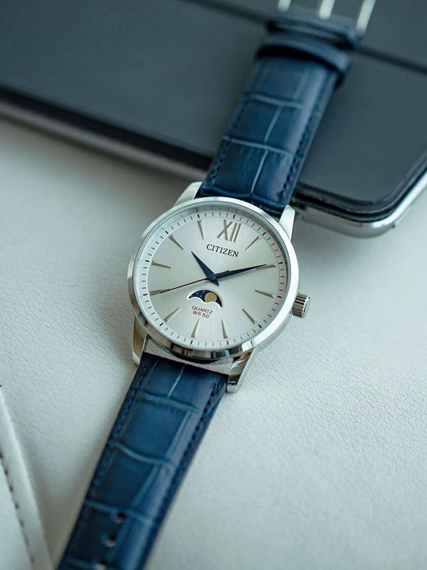 Часы Citizen AK5000-03A произведены в Японии и оснащены надёжным кварцевым механизмом калибра Citizen 6324. Корпус выполнен из нержавеющей стали и имеет классическую круглую форму диаметром 42 мм. Минеральное стеклоМинеральное стеклоМинеральное стекло представляет собой искусственно выращенный минерал кварца. Такое стекло отличается особой устойчивостью к повреждениям и царапинам. Уступает по некоторым качествам сапфировому стеклу. защищает серебристый циферблат, украшенный эффектом солнечных лучей по технологии Sunray. На циферблате расположены клиновидные стрелки в стиле Dauphine, метки в виде штрихов и римская цифра в положении 12 часов, а также индикатор фазы Луны — одно из самых востребованных усложнений в часовой классике. Часы защищены от воды по стандарту 50WR, что позволяет не бояться случайных брызг и дождя. Заводная головка отличается рифлёной поверхностью для удобства использования. Модель комплектуется синим кожаным ремешком с тиснением под кожу аллигатора и классической застёжкой. В качестве элемента питания используется батарейка SR621SW, обеспечивающая автономную работу до двух лет.