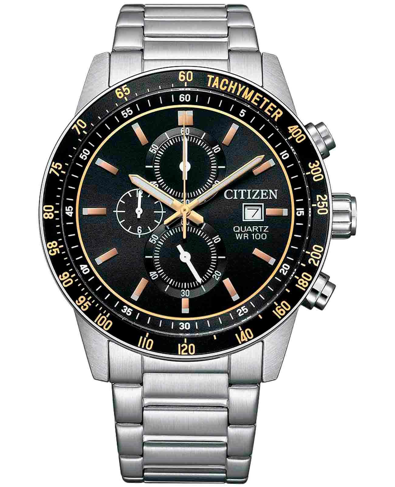 Citizen Chronograph AN3681-57E часы-хронографХронографФункция позволяет измерять отрезки времени с особой точностью: часы, минуты, секунды. Верным признаком хронографа является наличие на циферблате 3 дополнительных окошек-счётчиков. с секундомеромСекундомерСекундоме́р — прибор, способный измерять интервалы времени с точностью до долей секунды. спортивного дизайна с высоким уровнем водозащиты. Корпус из нержавеющей стали диаметром 44 мм идеально сбалансирован. Минеральное стеклоМинеральное стеклоМинеральное стекло представляет собой искусственно выращенный минерал кварца. Такое стекло отличается особой устойчивостью к повреждениям и царапинам. Уступает по некоторым качествам сапфировому стеклу. обеспечивает отличную защиту циферблата от царапин. Часы работают на основе кварцевого механизма. Стальной браслет на раскладной застёжкеРаскладная застёжкаТакой тип застёжки используется только на браслетах из металла. Она никогда не раскрывается полностью, происходит разделение на 2 и более частей. Раскладывающая застёжка снизит вероятность потери часов к минимуму. идеально дополняют дизайн часов, обеспечивая комфортное ношение. Стрелки и метки на циферблате имеют люминесцентное покрытиеЛюминесцентное покрытиеПозволяет считывать показания времени в темноте. Производители наносят на стрелки, часовые индексы, безель или поверхность циферблата светонакопительный состав, дающий холодное свечение. позволяющее легко определять время даже в темноте. БезельБезельВнешний ободок, закрепляющий стекло. В спортивных часах так называется поворотное кольцо с делениями на циферблате, выполняет роль таймера – замеряет отрезки времени на шкале. Неподвижный безель – элемент декора. Однонаправленно вращающийся безель на дайверских часах позволяет фиксировать моменты погружения и выныривания на поверхность. с IP-покрытиемIP-покрытиеМетод ионного напыления. Демонстрирует повышенную устойчивость к истиранию, окислению и химическим веществам. Под воздействием высокого давления и температуры около 1500°C молекулы металла надёжно соединяются с частицами корпуса часов. и шкалой тахиметраТахиметрРазмеченная шкала, располагается на ободке или безеле часов. Тахиметр позволяет рассчитать скорость на определённом участке пути, расстояние измеряется в километрах или милях.. Секундомер с точностью 1с и временем измерения 12ч отображается центральной стрелкой. Циферблат с метками в виде штрихов выполнен по технологии Sunray (солнечные лучи). Окошко даты находится в положении 3 часа. Часы обладают впечатляющей водонепроницаемостью до 100WR, что делает их идеальными для повседневной носки.