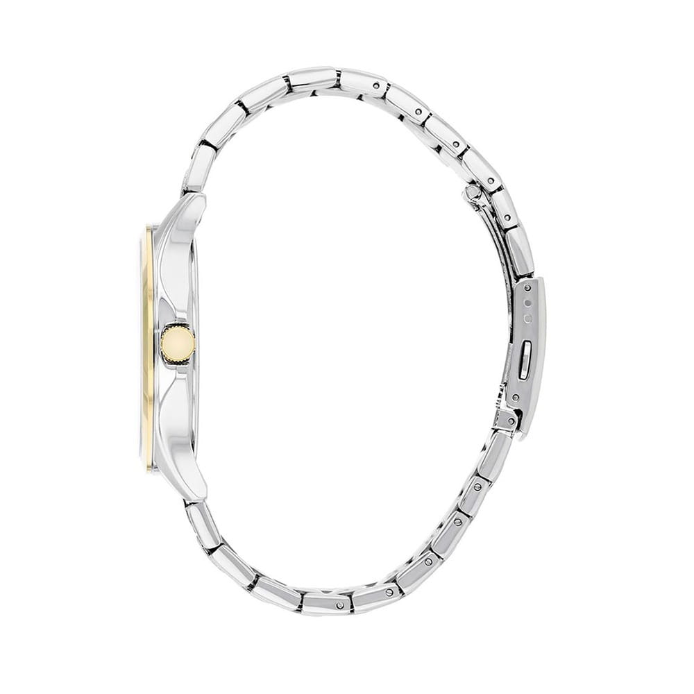 Часы Citizen BF2026-89A — это надежная модель, произведенная в Японии, с современным кварцевым механизмом Citizen 1502. Корпус выполнен из прочной нержавеющей стали и имеет диаметр 41 мм, что обеспечивает комфортную посадку на запястье. БезельБезельВнешний ободок, закрепляющий стекло. В спортивных часах так называется поворотное кольцо с делениями на циферблате, выполняет роль таймера – замеряет отрезки времени на шкале. Неподвижный безель – элемент декора. Однонаправленно вращающийся безель на дайверских часах позволяет фиксировать моменты погружения и выныривания на поверхность. с элегантным золотистым IP-покрытиемIP-покрытиеМетод ионного напыления. Демонстрирует повышенную устойчивость к истиранию, окислению и химическим веществам. Под воздействием высокого давления и температуры около 1500°C молекулы металла надёжно соединяются с частицами корпуса часов.. Серебристый циферблат украшен четкими арабскими цифрами и дополнен окошком календаря с отображением даты и дня недели в позиции «3 часа». Минеральное стеклоМинеральное стеклоМинеральное стекло представляет собой искусственно выращенный минерал кварца. Такое стекло отличается особой устойчивостью к повреждениям и царапинам. Уступает по некоторым качествам сапфировому стеклу. защищает часы от случайных царапин, а водозащита до 50 метров позволяет не снимать их во время повседневных дел и легких водных процедур. Стрелки с люминесцентным покрытиемЛюминесцентное покрытиеПозволяет считывать показания времени в темноте. Производители наносят на стрелки, часовые индексы, безель или поверхность циферблата светонакопительный состав, дающий холодное свечение. обеспечивают отличную видимость в темноте. Стальной браслет с частичным золотистым IP-покрытиемIP-покрытиеМетод ионного напыления. Демонстрирует повышенную устойчивость к истиранию, окислению и химическим веществам. Под воздействием высокого давления и температуры около 1500°C молекулы металла надёжно соединяются с частицами корпуса часов. оснащен надежной раскладной застёжкойРаскладная застёжкаТакой тип застёжки используется только на браслетах из металла. Она никогда не раскрывается полностью, происходит разделение на 2 и более частей. Раскладывающая застёжка снизит вероятность потери часов к минимуму., а рифленая заводная головка с защитой подчеркивает внимание к деталям и практичность модели.
