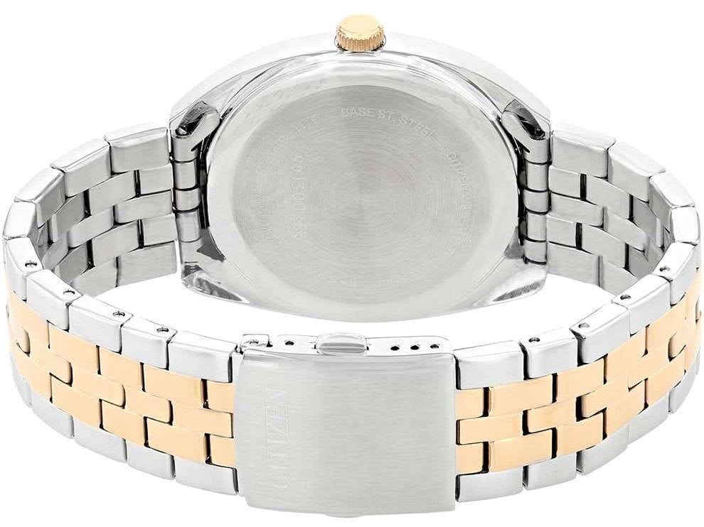 Часы Citizen BI5096-53L — это стильная и надежная модель японского производства, оснащённая высокоточным кварцевым механизмом Citizen G111. Круглый корпус диаметром 42 мм выполнен из нержавеющей стали, что придаёт изделию элегантный и современный вид, а также защищает от внешних воздействий. БезельБезельВнешний ободок, закрепляющий стекло. В спортивных часах так называется поворотное кольцо с делениями на циферблате, выполняет роль таймера – замеряет отрезки времени на шкале. Неподвижный безель – элемент декора. Однонаправленно вращающийся безель на дайверских часах позволяет фиксировать моменты погружения и выныривания на поверхность. с элегантным золотистым IP-покрытиемIP-покрытиеМетод ионного напыления. Демонстрирует повышенную устойчивость к истиранию, окислению и химическим веществам. Под воздействием высокого давления и температуры около 1500°C молекулы металла надёжно соединяются с частицами корпуса часов.. Синий циферблат оформлен минималистично, с метками в виде аккуратных штрихов и заострёнными прямоугольными стрелками в стиле Baton с люминесцентным покрытиемЛюминесцентное покрытиеПозволяет считывать показания времени в темноте. Производители наносят на стрелки, часовые индексы, безель или поверхность циферблата светонакопительный состав, дающий холодное свечение. для удобного считывания времени даже в темноте. Минеральное стеклоМинеральное стеклоМинеральное стекло представляет собой искусственно выращенный минерал кварца. Такое стекло отличается особой устойчивостью к повреждениям и царапинам. Уступает по некоторым качествам сапфировому стеклу. гарантирует защиту от царапин и сохраняет презентабельный внешний вид на долгое время. Окошко календаря с отображением числа расположено в позиции 6 часов, что добавляет функциональности и подчеркивает современный стиль модели. Рифленая заводная головка обеспечивает лёгкость настройки, а стальной браслет с частичным золотистым IP-покрытиемIP-покрытиеМетод ионного напыления. Демонстрирует повышенную устойчивость к истиранию, окислению и химическим веществам. Под воздействием высокого давления и температуры около 1500°C молекулы металла надёжно соединяются с частицами корпуса часов. и раскладывающейся застёжкой надёжно фиксирует часы на запястье. Водозащита до 50 метров позволяет не опасаться случайного контакта с водой в повседневной жизни.