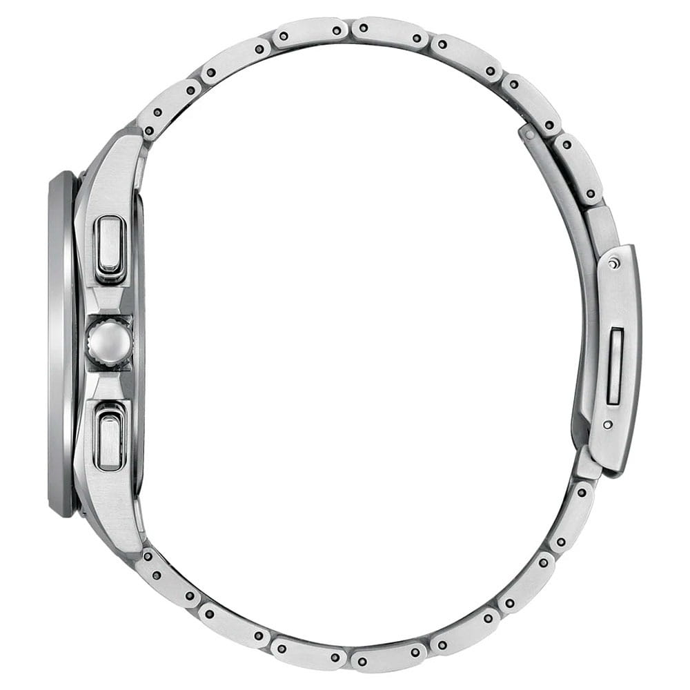 Часы Citizen BY1001-66E — это гармоничное сочетание современного японского стиля, передовых технологий и высокого уровня надежности. Модель выполнена в прочном и легком корпусе из инновационного суперлегкого титана Super Titanium Duratect TIC диаметром 41,5 мм и толщиной 10,8 мм, дополненном браслетом шириной 22 мм с удобной раскладной застёжкойРаскладная застёжкаТакой тип застёжки используется только на браслетах из металла. Она никогда не раскрывается полностью, происходит разделение на 2 и более частей. Раскладывающая застёжка снизит вероятность потери часов к минимуму.. Кварцевый механизм калибра Citizen H874 оснащен системой Eco-Drive, которая работает на солнечной энергии, не требуя замены батарейки, и обеспечивает запас хода до 180 дней. Часы отличаются высокой точностью хода — отклонение составляет всего +/- 15 секунд в месяц. Среди функциональных особенностей — автоматическая настройка времени по радиосигналу для Германии, Японии, США и Китая, вечный календарь, функция мирового времениМировое время Полезное часовое усложнение, отображающее время в основных городах и известных областях по всему миру, оно связано с часовыми поясами, удобно для путешественников и бизнесменов. , 12/24-часовой формат, автоматическое переключение летнего и зимнего времени, а также уникальный полностью автоматизированный радиоуправляемый механизм определения фаз Луны с возможностью отображения как для северного, так и южного полушария. На черном циферблате расположена апертура даты в положении 4 часа, все стрелки с люминесцентным покрытиемЛюминесцентное покрытиеПозволяет считывать показания времени в темноте. Производители наносят на стрелки, часовые индексы, безель или поверхность циферблата светонакопительный состав, дающий холодное свечение. для отличной читаемости в любое время суток. Устойчивое к царапинам сапфировое стеклоСапфировое стеклоПрочный и надёжный материал из кристалла сапфира синтетического происхождения, характеризующийся особой твёрдостью и устойчивостью к царапинам и повреждениям. с антибликовым покрытиемАнтибликовое покрытиеСлой оксида металла в 0,13-0,3 микрон, благодаря которому стекло часов не бликует и не отражает свет. Антибликовое покрытие уменьшает отражение света в 10 раз, обеспечивая отличную читаемость показателей циферблата. надежно защищает циферблат. Водозащита уровня WR 100 позволяет использовать часы при плавании без погружения.