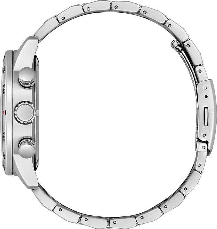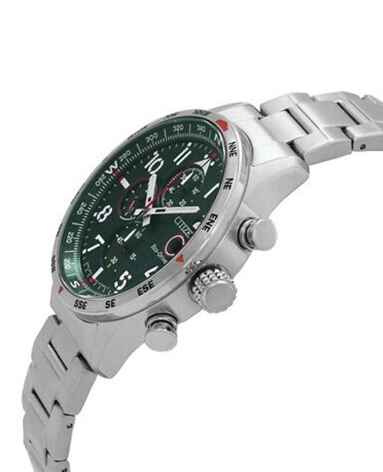 Citizen CA0791-81X — это стильные многофункциональные спортивные часы, сочетающие японское качество, современные технологии и надежность. Корпус и браслет выполнены из прочной нержавеющей стали, что обеспечивает долговечность и элегантный внешний вид, а зеленый циферблат с метками в виде штрихов и арабских цифр подчеркивает динамичный и современный характер модели. На безельБезельВнешний ободок, закрепляющий стекло. В спортивных часах так называется поворотное кольцо с делениями на циферблате, выполняет роль таймера – замеряет отрезки времени на шкале. Неподвижный безель – элемент декора. Однонаправленно вращающийся безель на дайверских часах позволяет фиксировать моменты погружения и выныривания на поверхность. нанесены красные стрелки компаса. Часы оснащены кварцевым механизмом Citizen B612 с инновационной системой Eco-Drive, работающей на солнечной энергии, что позволяет забыть о регулярной замене батарейки и обеспечивает запас хода до 210 дней. Присутствует функция индикации заряда EOLEOLПредставляет собой систему, уведомляющую владельца часов о необходимости замены элемента питания. За 2 недели до полного разряда батарейки секундная стрелка перестаёт ходить чётко и начинает перепрыгивать на 3-4 деления. и система предотвращения перезарядки. Модель оснащена хронографомХронографФункция позволяет измерять отрезки времени с особой точностью: часы, минуты, секунды. Верным признаком хронографа является наличие на циферблате 3 дополнительных окошек-счётчиков. с секундомеромСекундомерСекундоме́р — прибор, способный измерять интервалы времени с точностью до долей секунды., измеряющим время с точностью до 1/5 секунды и максимальной продолжительностью замера до 1 часа, а также поддерживает отображение времени в 12- и 24-часовом формате. Стрелки с люминесцентным покрытиемЛюминесцентное покрытиеПозволяет считывать показания времени в темноте. Производители наносят на стрелки, часовые индексы, безель или поверхность циферблата светонакопительный состав, дающий холодное свечение. обеспечивают отличную читаемость времени даже в темное время суток. Прочное минеральное стеклоМинеральное стеклоМинеральное стекло представляет собой искусственно выращенный минерал кварца. Такое стекло отличается особой устойчивостью к повреждениям и царапинам. Уступает по некоторым качествам сапфировому стеклу. надежно защищает циферблат от царапин и повреждений, а водозащита 100WR позволяет не снимать часы во время плавания и активного отдыха. Удобное окошко даты расположено в положении 3 часа, а браслет снабжен раскладной застёжкойРаскладная застёжкаТакой тип застёжки используется только на браслетах из металла. Она никогда не раскрывается полностью, происходит разделение на 2 и более частей. Раскладывающая застёжка снизит вероятность потери часов к минимуму. для комфортного ношения. Диаметр корпуса составляет 43 мм, толщина 12,8 мм, а вес — 153 г, что делает эту модель отличным выбором для ценителей функциональности и современного стиля.