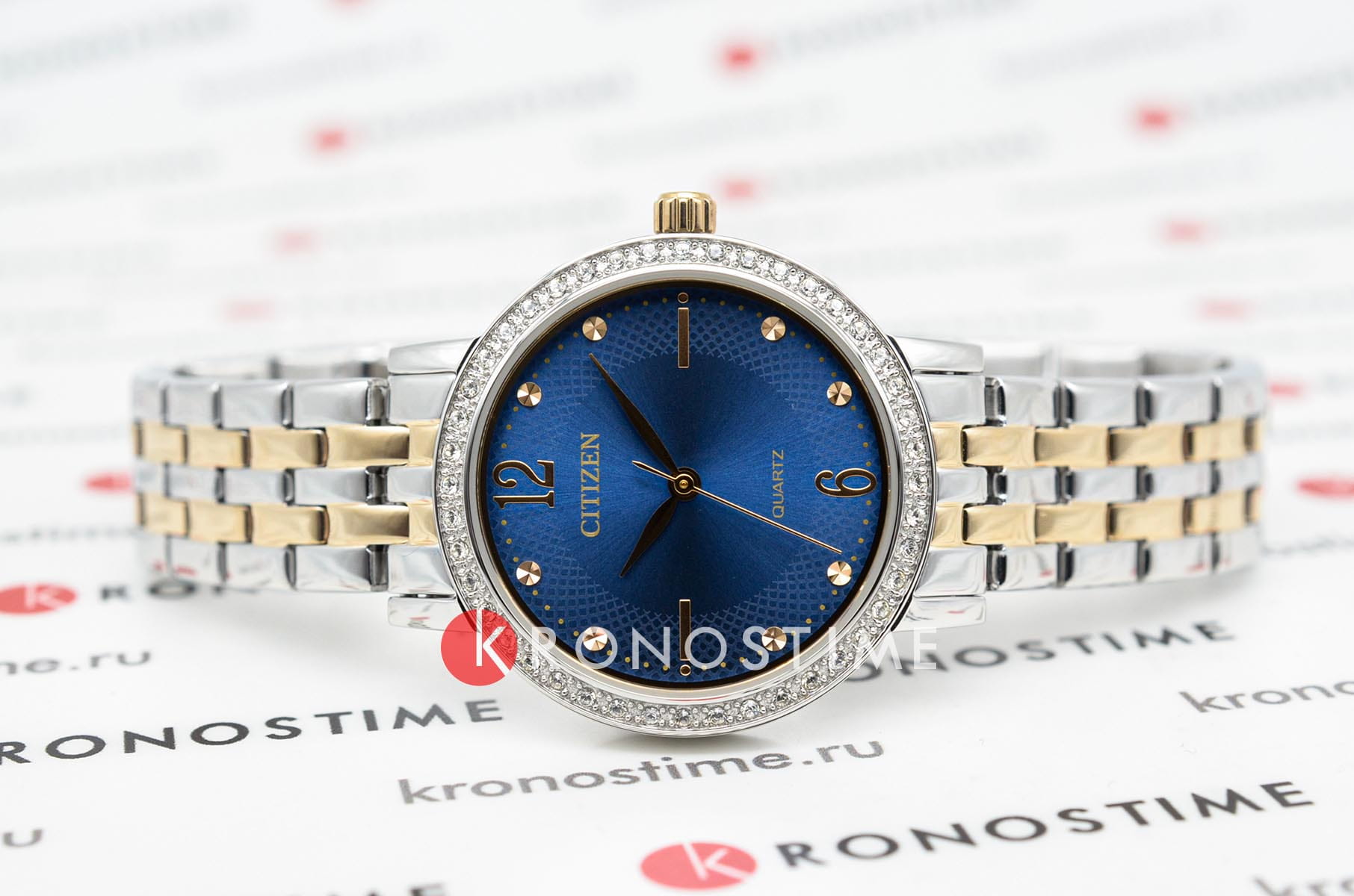 Часы Citizen EL3106-59L представляют собой элегантную модель, выполненную в Японии, сочетающую в себе современные технологии и утончённый дизайн. Корпус изготовлен из прочной нержавеющей стали, что обеспечивает долговечность и привлекательный внешний вид. Диаметр корпуса составляет 31 мм, а толщина — всего 7 мм, что делает часы изящными и аккуратными на запястье. Особое внимание привлекает безельБезельВнешний ободок, закрепляющий стекло. В спортивных часах так называется поворотное кольцо с делениями на циферблате, выполняет роль таймера – замеряет отрезки времени на шкале. Неподвижный безель – элемент декора. Однонаправленно вращающийся безель на дайверских часах позволяет фиксировать моменты погружения и выныривания на поверхность., украшенный мерцающими кристаллами, которые придают часам особый шарм и изысканность. Надёжный кварцевый механизм гарантирует точность хода, а водозащита уровня WR 50 позволяет не снимать часы при мытье рук или во время дождя. Синий циферблат украшен часовыми индексами в виде точек и цифр, а также оснащён центральными стрелками часов, минут и секунд для удобного считывания времени и кристаллами. Минеральное стеклоМинеральное стеклоМинеральное стекло представляет собой искусственно выращенный минерал кварца. Такое стекло отличается особой устойчивостью к повреждениям и царапинам. Уступает по некоторым качествам сапфировому стеклу. устойчиво к появлению мелких царапин, сохраняя прозрачность и презентабельный вид. Стальной браслет с частичным золотистым IP-покрытиемIP-покрытиеМетод ионного напыления. Демонстрирует повышенную устойчивость к истиранию, окислению и химическим веществам. Под воздействием высокого давления и температуры около 1500°C молекулы металла надёжно соединяются с частицами корпуса часов. и раскладной застёжкойРаскладная застёжкаТакой тип застёжки используется только на браслетах из металла. Она никогда не раскрывается полностью, происходит разделение на 2 и более частей. Раскладывающая застёжка снизит вероятность потери часов к минимуму. надежно фиксирует часы на запястье, обеспечивая комфорт при ежедневном ношении.