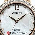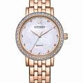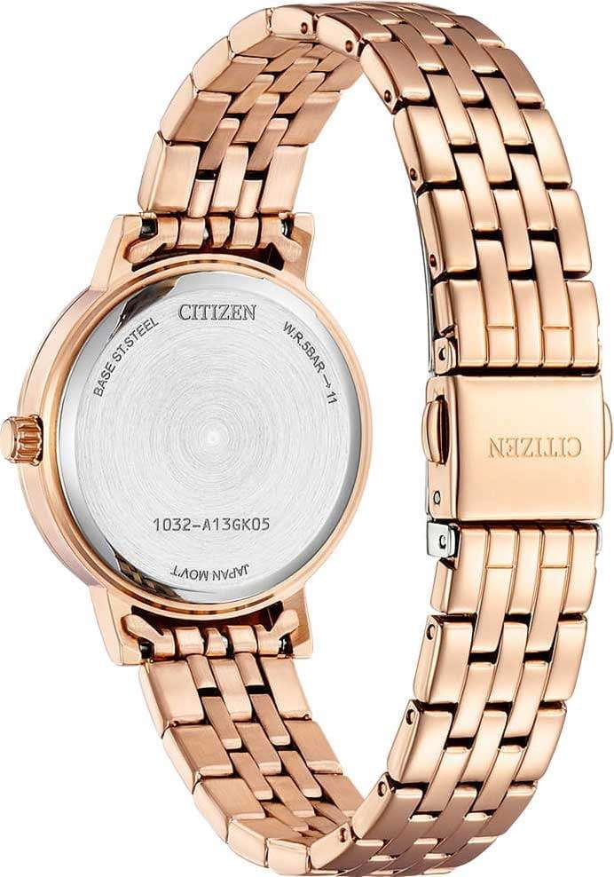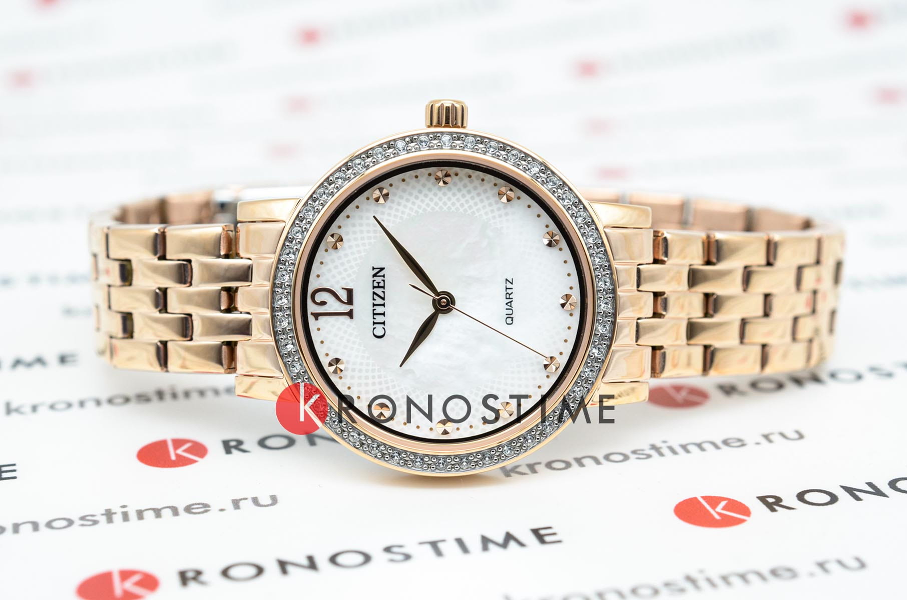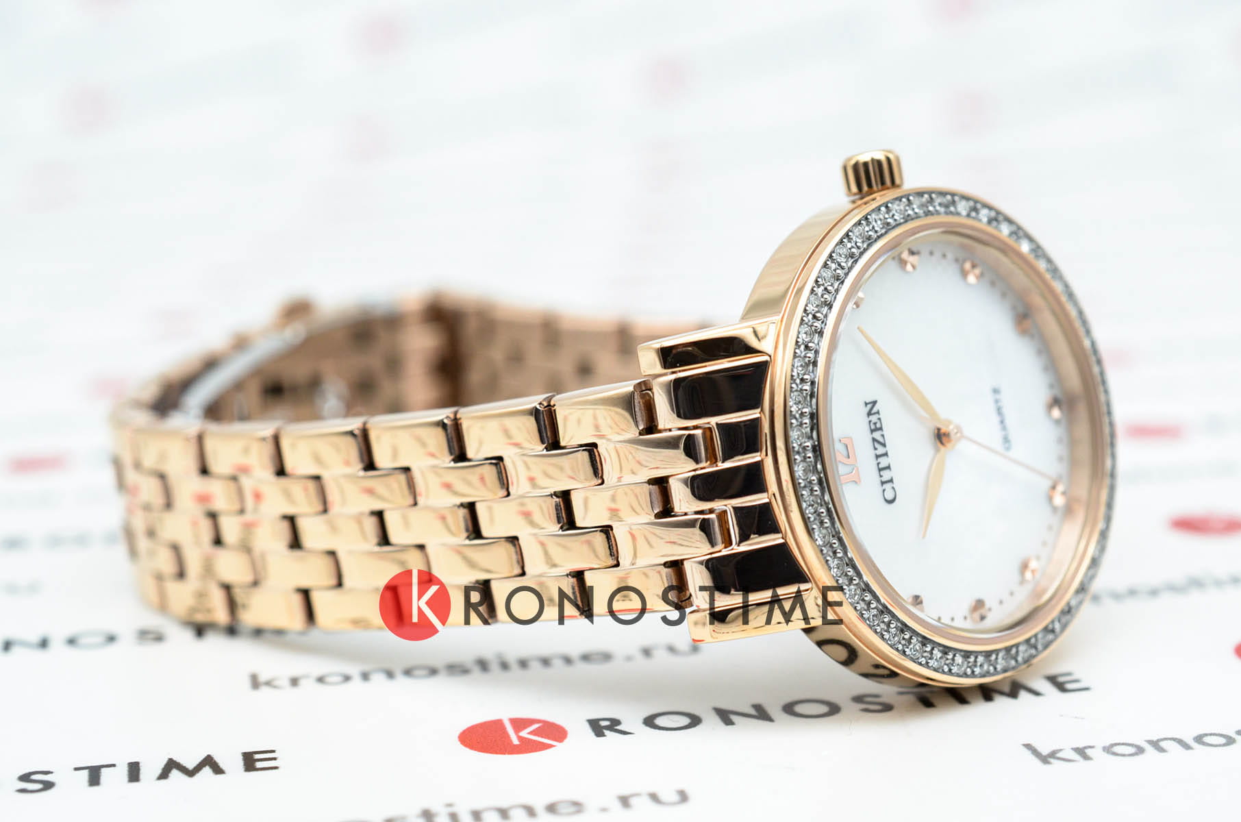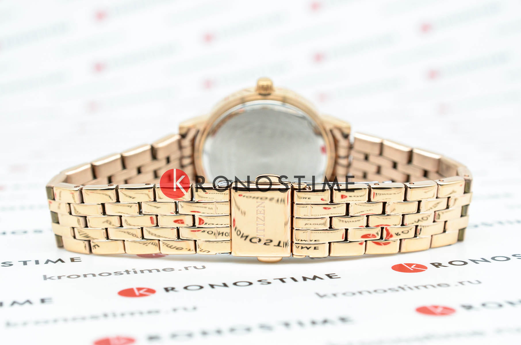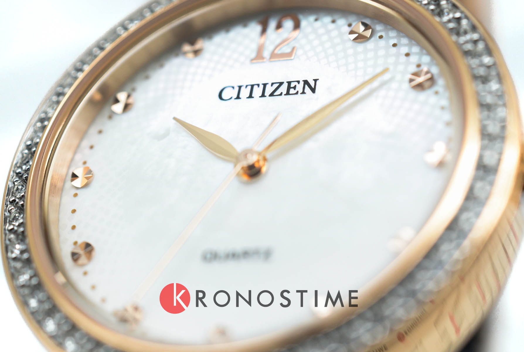 Часы Citizen EL3108-53D представляют собой элегантную модель, выполненную в Японии, сочетающую в себе современные технологии и утончённый дизайн. Корпус и браслет изготовлены из прочной нержавеющей стали с золотистым IP-покрытиемIP-покрытиеМетод ионного напыления. Демонстрирует повышенную устойчивость к истиранию, окислению и химическим веществам. Под воздействием высокого давления и температуры около 1500°C молекулы металла надёжно соединяются с частицами корпуса часов., что обеспечивает долговечность и привлекательный внешний вид. Диаметр корпуса составляет 31 мм, а толщина — всего 7 мм, что делает часы изящными и аккуратными на запястье. Особое внимание привлекает безельБезельВнешний ободок, закрепляющий стекло. В спортивных часах так называется поворотное кольцо с делениями на циферблате, выполняет роль таймера – замеряет отрезки времени на шкале. Неподвижный безель – элемент декора. Однонаправленно вращающийся безель на дайверских часах позволяет фиксировать моменты погружения и выныривания на поверхность., украшенный мерцающими кристаллами, которые придают часам особый шарм и изысканность. Надёжный кварцевый механизм гарантирует точность хода, а водозащита уровня WR 50 позволяет не снимать часы при мытье рук или во время дождя. Перламутровый циферблат украшен часовыми индексами в виде точек и цифр, а также оснащён центральными стрелками часов, минут и секунд для удобного считывания времени и кристаллами. Минеральное стеклоМинеральное стеклоМинеральное стекло представляет собой искусственно выращенный минерал кварца. Такое стекло отличается особой устойчивостью к повреждениям и царапинам. Уступает по некоторым качествам сапфировому стеклу. устойчиво к появлению мелких царапин, сохраняя прозрачность и презентабельный вид.  Стальной браслет с золотистым  IP-покрытиемIP-покрытиеМетод ионного напыления. Демонстрирует повышенную устойчивость к истиранию, окислению и химическим веществам. Под воздействием высокого давления и температуры около 1500°C молекулы металла надёжно соединяются с частицами корпуса часов. и раскладной застёжкойРаскладная застёжкаТакой тип застёжки используется только на браслетах из металла. Она никогда не раскрывается полностью, происходит разделение на 2 и более частей. Раскладывающая застёжка снизит вероятность потери часов к минимуму. надежно фиксирует часы на запястье, обеспечивая комфорт при ежедневном ношении.