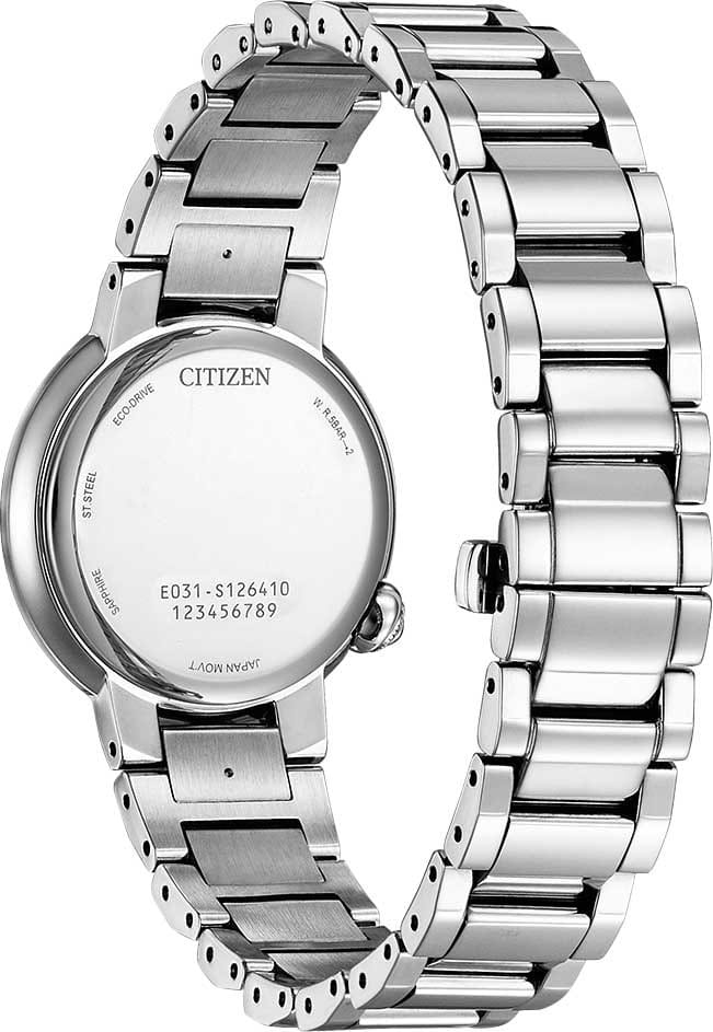 Часы Citizen EM0910-80N — воплощение изысканности и современных технологий, выполненное в Японии. Корпус и литой браслет изготовлены из прочной нержавеющей стали, что гарантирует долговечность и элегантный внешний вид. Перламутровый синий циферблат с завораживающими переливами украшен бриллиантом, а часовые метки выполнены в виде точек, что придаёт образу особую утонченность. Заводная головка с защитой находится в положении 8 часов и также украшена камнем. Защиту от царапин обеспечивает сапфировое стеклоСапфировое стеклоПрочный и надёжный материал из кристалла сапфира синтетического происхождения, характеризующийся особой твёрдостью и устойчивостью к царапинам и повреждениям., сохраняющее безупречный вид часов на длительное время. Модель оснащена инновационной системой Eco-Drive, работающей на солнечной энергии и не требующей замены батарейки, с запасом хода до 180 дней. Предусмотрена функция индикации уровня заряда (EOLEOLПредставляет собой систему, уведомляющую владельца часов о необходимости замены элемента питания. За 2 недели до полного разряда батарейки секундная стрелка перестаёт ходить чётко и начинает перепрыгивать на 3-4 деления.) и предотвращения перезарядки. Диаметр корпуса составляет 30 мм, толщина — 8,5 мм, вес — 74 г, что обеспечивает комфортное ношение в течение всего дня. Водозащита уровня 50WR позволяет не снимать часы при мытье рук или в дождливую погоду. Браслет с застежкой «бабочка»Застёжка "бабочка"Такой вид застёжки дополняется предохранителями, помогающими избежать случайного раскрытия браслета. Обладают изящным исполнением. обеспечивает дополнительный комфорт и безопасность при носке. Эта модель станет не только стильным аксессуаром, но и символом безупречного вкуса и внимания к деталям.