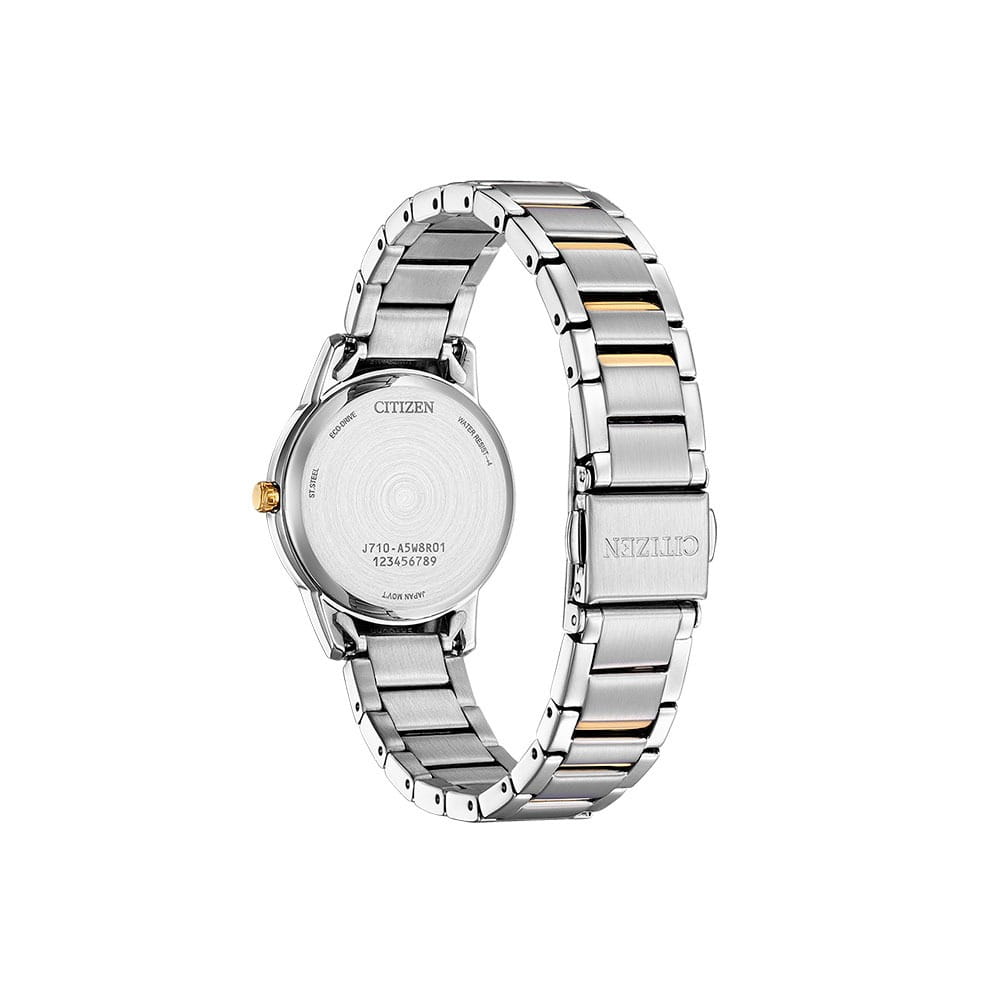 Citizen FE1244-72A— изящные японские часы, сочетающие современные технологии и классический стиль. Модель оснащена надежным кварцевым механизмом Citizen J710 с инновационной системой Eco-Drive, обеспечивающей питание от солнечной энергии без необходимости замены батарейки. Корпус и браслет выполнены из высококачественной нержавеющей стали, а на браслет (частично) нанесено IP-покрытиеIP-покрытиеМетод ионного напыления. Демонстрирует повышенную устойчивость к истиранию, окислению и химическим веществам. Под воздействием высокого давления и температуры около 1500°C молекулы металла надёжно соединяются с частицами корпуса часов., что гарантирует долговечность и комфорт при ежедневном ношении. Браслет оснащен надежной раскладной застёжкойРаскладная застёжкаТакой тип застёжки используется только на браслетах из металла. Она никогда не раскрывается полностью, происходит разделение на 2 и более частей. Раскладывающая застёжка снизит вероятность потери часов к минимуму. с системой блокировки, что обеспечивает дополнительную безопасность при ношении. Защиту от мелких повреждений обеспечивает прочное минеральное стеклоМинеральное стеклоМинеральное стекло представляет собой искусственно выращенный минерал кварца. Такое стекло отличается особой устойчивостью к повреждениям и царапинам. Уступает по некоторым качествам сапфировому стеклу.. Нежно-желтый циферблат, выполненный по технологии Sunray (солнечные лучи), украшен аккуратными часовыми метками и арабскими цифрами, предусмотрена функция индикации даты. Функция индикации заряда EOLEOLПредставляет собой систему, уведомляющую владельца часов о необходимости замены элемента питания. За 2 недели до полного разряда батарейки секундная стрелка перестаёт ходить чётко и начинает перепрыгивать на 3-4 деления. своевременно подскажет о необходимости подзарядки. Водостойкость WR 30 позволяет не беспокоиться о случайных брызгах воды. Диаметр корпуса составляет 29,4 мм, что делает модель особенно элегантной и удобной.
