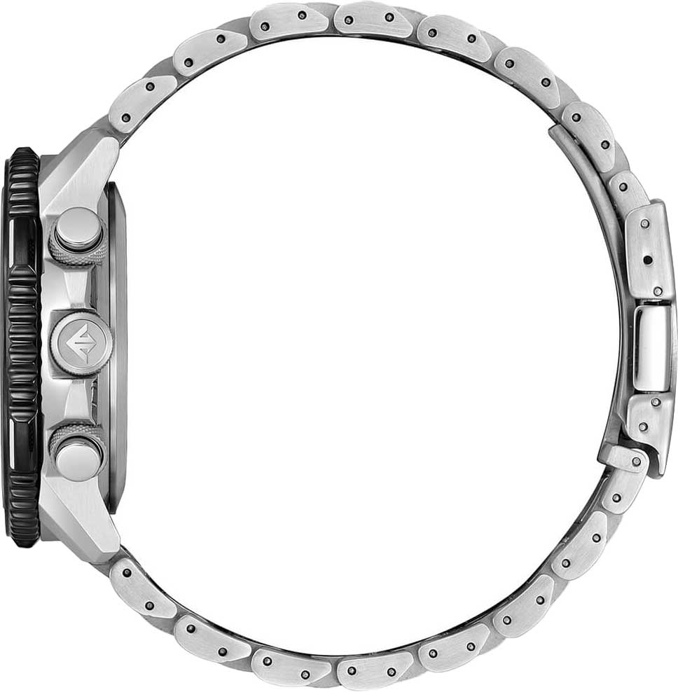 Citizen Promaster JY8086-89X часы-хронографХронографФункция позволяет измерять отрезки времени с особой точностью: часы, минуты, секунды. Верным признаком хронографа является наличие на циферблате 3 дополнительных окошек-счётчиков. с секундомеромСекундомерСекундоме́р — прибор, способный измерять интервалы времени с точностью до долей секунды. спортивного дизайна с высоким уровнем водозащиты. Корпус из нержавеющей стали диаметром 45,4 мм идеально сбалансирован. Сапфировое стеклоСапфировое стеклоПрочный и надёжный материал из кристалла сапфира синтетического происхождения, характеризующийся особой твёрдостью и устойчивостью к царапинам и повреждениям. с антибликовым покрытием обеспечивает отличную защиту циферблата от царапин. Часы работают на основе кварцевого механизма, питание от солнечной энергии. Стальной браслет на раскладной застёжкеРаскладная застёжкаТакой тип застёжки используется только на браслетах из металла. Она никогда не раскрывается полностью, происходит разделение на 2 и более частей. Раскладывающая застёжка снизит вероятность потери часов к минимуму. идеально дополняют дизайн часов, обеспечивая комфортное ношение. Стрелки и метки на циферблате имеют люминесцентное покрытиеЛюминесцентное покрытиеПозволяет считывать показания времени в темноте. Производители наносят на стрелки, часовые индексы, безель или поверхность циферблата светонакопительный состав, дающий холодное свечение. позволяющее легко определять время даже в темноте. Поворотный безельБезельВнешний ободок, закрепляющий стекло. В спортивных часах так называется поворотное кольцо с делениями на циферблате, выполняет роль таймера – замеряет отрезки времени на шкале. Неподвижный безель – элемент декора. Однонаправленно вращающийся безель на дайверских часах позволяет фиксировать моменты погружения и выныривания на поверхность. с IP-покрытиемIP-покрытиеМетод ионного напыления. Демонстрирует повышенную устойчивость к истиранию, окислению и химическим веществам. Под воздействием высокого давления и температуры около 1500°C молекулы металла надёжно соединяются с частицами корпуса часов.. Автоматический прием сигналов от радиовышек, расположенных в различных точках земного шара, которые передают временные сигналы от определенных атомных часов. Коррекция текущего времени радиосигналом на территории почти всей Европы, США, Японии и Китая. Функция индикации заряда (EOL) и предотвращения перезарядки. Мировое времяМировое время Полезное часовое усложнение, отображающее время в основных городах и известных областях по всему миру, оно связано с часовыми поясами, удобно для путешественников и бизнесменов. - 43 города (29 часовых поясов), переход на зимнее и летнее время. Всемирное координированное время UTCUTCВсемирное кординационное время, не имеющее привязки к географическому положению Гринвича, основывается на атомном отсчёте времени. Регулировка времени осуществляется более точно, чем устаревшее GMT.