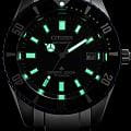 Citizen Promaster NB6026-56L - спортивный характер этих часов оценят современные мужчины, которые отдают предпочтение практичным и функциональным вещам. Лимитированная серия - 4500 экземпляров. Модель вдохновлена часами Citizen Challenge Diver 1977 года и посвящена 35-ти летию линейки Promaster. Сертифицированные часы для дайвинга (ISO 6425). Корпус из титана (Super Titanium™) диаметром 41 мм идеально сбалансирован. Сапфировое стеклоСапфировое стеклоПрочный и надёжный материал из кристалла сапфира синтетического происхождения, характеризующийся особой твёрдостью и устойчивостью к царапинам и повреждениям. с антибликовым покрытием обеспечивает отличную защиту циферблата от царапин. Титановый браслет на раскладной застёжкеРаскладная застёжкаТакой тип застёжки используется только на браслетах из металла. Она никогда не раскрывается полностью, происходит разделение на 2 и более частей. Раскладывающая застёжка снизит вероятность потери часов к минимуму. с удлинением для дайверов идеально дополняют дизайн часов, обеспечивая комфортное ношение. Стрелки и метки на циферблате имеют люминесцентное покрытиеЛюминесцентное покрытиеПозволяет считывать показания времени в темноте. Производители наносят на стрелки, часовые индексы, безель или поверхность циферблата светонакопительный состав, дающий холодное свечение. позволяющее легко определять время даже в темноте. Титановый безельБезельВнешний ободок, закрепляющий стекло. В спортивных часах так называется поворотное кольцо с делениями на циферблате, выполняет роль таймера – замеряет отрезки времени на шкале. Неподвижный безель – элемент декора. Однонаправленно вращающийся безель на дайверских часах позволяет фиксировать моменты погружения и выныривания на поверхность. с DLC-покрытиемDLC-покрытиеDiamond like carbon - одно из лучших видов покрытия, представляющее собой углерод с алмазными свойствами. На поверхность материала наносятся распавшиеся молекулы углерода, превращающиеся в плёнку из алмазоподобных связей, которая перенимает твёрдость алмаза. вращается в одном направлении. Запас хода 42 часа. Защищены от магнитных полей - 16000A/m. Окошко даты находится в положении 3 часа. Часы обладают впечатляющей водонепроницаемостью до 200WR, что делает их идеальными для плавания, ныряния и погружений с аквалангом. Завинчивающаяся задняя крышка и заводная головка.