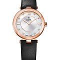 Женственные коктейльные часы COVER CO193.09 из коллекции Amelia работают на кварцевом калибре ETA. Циферблат имеет центральную область серебристого цвета с узором Sunray и белую перламутровую периферийную часть, которые защищены минеральным стекломМинеральное стеклоМинеральное стекло представляет собой искусственно выращенный минерал кварца. Такое стекло отличается особой устойчивостью к повреждениям и царапинам. Уступает по некоторым качествам сапфировому стеклу. с сапфировым напылением. В качестве часовых меток используются 8 кристаллов Swarovski, а также 3 накладных индекса и арабская цифра «12». Корпус 32 мм диаметром выполнен из нержавеющей стали с PVD-покрытиемPVDУльтратонкое покрытие наносится в технике вакуумного напыления, сочетает в себе нитрид титана особой прочности со слоем золота или оксида хрома. Несёт в себе декоративную или защитную функцию. цвета розового золота, с широким полированным безелемБезельВнешний ободок, закрепляющий стекло. В спортивных часах так называется поворотное кольцо с делениями на циферблате, выполняет роль таймера – замеряет отрезки времени на шкале. Неподвижный безель – элемент декора. Однонаправленно вращающийся безель на дайверских часах позволяет фиксировать моменты погружения и выныривания на поверхность.. Часы комплектуются черным кожаным ремешком на стандартной застёжке и имеют маркировку «Swiss Made».