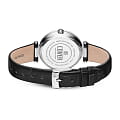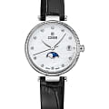 Женские наручные часы Cover CO196.04 из коллекции Fly Me To The Moon сочетают в себе элегантность и точность швейцарского производства. Модель обладает круглым корпусом диаметром 32 мм, изготовленным из нержавеющей стали с полированным покрытием. Браслет выполнен из черной кожаной ремешка, оснащенный классической застежкой для комфортного ношения. Белый перламутровый циферблат украшен 11 кристаллами, которые выполняют роль индексов часов, а также имеет окно фаз Луны на «6 часах» и апертуру даты на «3 часах». Для защиты используется стекло с антибликовым покрытиемАнтибликовое покрытиеСлой оксида металла в 0,13-0,3 микрон, благодаря которому стекло часов не бликует и не отражает свет. Антибликовое покрытие уменьшает отражение света в 10 раз, обеспечивая отличную читаемость показателей циферблата., обеспечивающее превосходную читаемость времени при любых условиях освещения. Часы работают на высокоточном кварцевом механизме, гарантирующем исключительную точность хода без необходимости подзаводки. Водонепроницаемость часов достигает 5 атмосфер (WR 50), что позволяет использовать их в повседневной жизни, однако не рекомендуется для контакта с водой во время плавания или дайвинга. Эти швейцарские часы станут идеальным дополнением как классического, так и повседневного образа женщины, ценящей элегантность и качество.