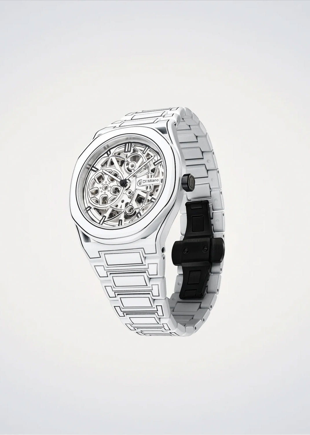 Часы D1 Milano Skeleton SKBJ20 — это эффектные механические мужские часы, разработанные для ценителей уникальных аксессуаров. Их утонченный дизайн и высокое качество исполнения делают эти часы незаменимым элементом вашего стиля. Изготовленные в Италии, они оснащены надежным механизмом Seiko TMI NH70L с автоподзаводом, обеспечивающими запас хода до 41 часа. Частота работы механизма составляет 21600 полуколебаний в час. Часы имеют корпус из нержавеющей стали с керамическим покрытием Cerakote, что гарантирует долговечность и стойкость к внешним воздействиям. Скелетонизированный циферблат защищен сапфировым стекломСапфировое стеклоПрочный и надёжный материал из кристалла сапфира синтетического происхождения, характеризующийся особой твёрдостью и устойчивостью к царапинам и повреждениям. с антибликовым покрытиемАнтибликовое покрытиеСлой оксида металла в 0,13-0,3 микрон, благодаря которому стекло часов не бликует и не отражает свет. Антибликовое покрытие уменьшает отражение света в 10 раз, обеспечивая отличную читаемость показателей циферблата., подчеркивающим элегантность и изысканность модели и защищает от царапин. Метки в виде штрихов и прозрачная задняя крышка, закрепленная на 8 винтах, придают часам особый шарм. Стальной браслет на застёжке-бабочке с кнопкамиЗастёжка "бабочка"Такой вид застёжки дополняется предохранителями, помогающими избежать случайного раскрытия браслета. Обладают изящным исполнением. обеспечивает комфортное и надежное ношение. Водозащита до 50 WR делает эти часы подходящими для повседневного использования.