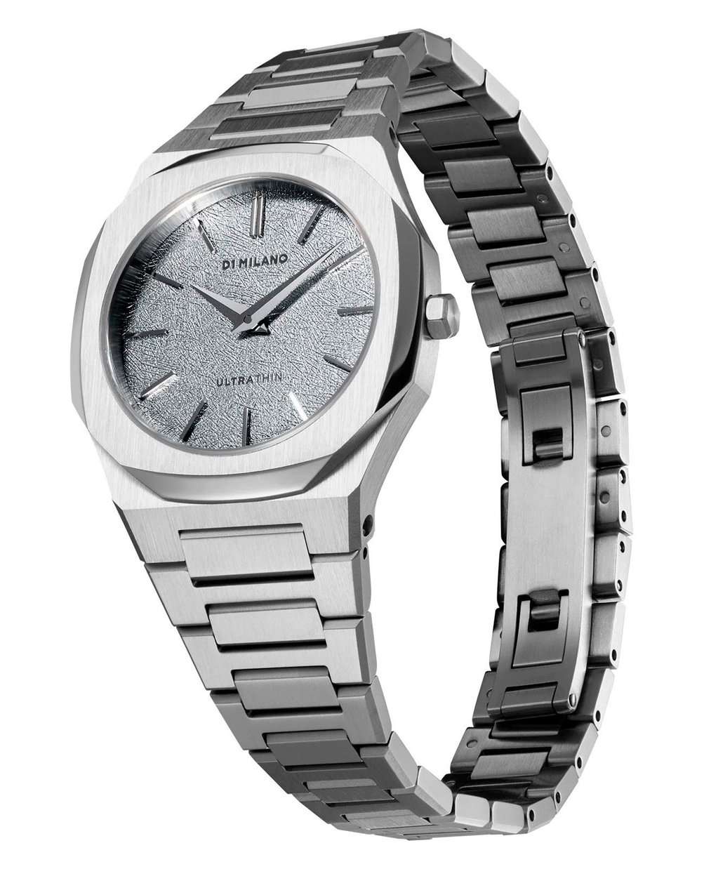 Женские наручные часы D1 Milano UTBL35 из коллекции Ultra Thin сочетают в себе элегантный дизайн и современные технологии. Модель обладает круглым корпусом диаметром 30 мм, изготовленным из нержавеющей стали, что обеспечивает высокую устойчивость к внешним воздействиям. Для защиты циферблата используется сапфировое стеклоСапфировое стеклоПрочный и надёжный материал из кристалла сапфира синтетического происхождения, характеризующийся особой твёрдостью и устойчивостью к царапинам и повреждениям., которое эффективно противостоит царапинам и механическим повреждениям. Часы оснащены кварцевым механизмом Miyota 1L22, гарантирующим точное время без необходимости подзаводки. Водонепроницаемость модели достигает 5 атмосфер (50 метров), что позволяет использовать их при контакте с водой, например, во время мытья рук или дождя. Браслет выполнен из нержавеющей стали на раскладной застёжкеРаскладная застёжкаТакой тип застёжки используется только на браслетах из металла. Она никогда не раскрывается полностью, происходит разделение на 2 и более частей. Раскладывающая застёжка снизит вероятность потери часов к минимуму., обеспечивающей комфортное ношение и безопасность. Циферблат с узором Light Sunray серебристого цвета придает часам особую изысканность и делает их идеальным выбором для повседневного использования или особых случаев.