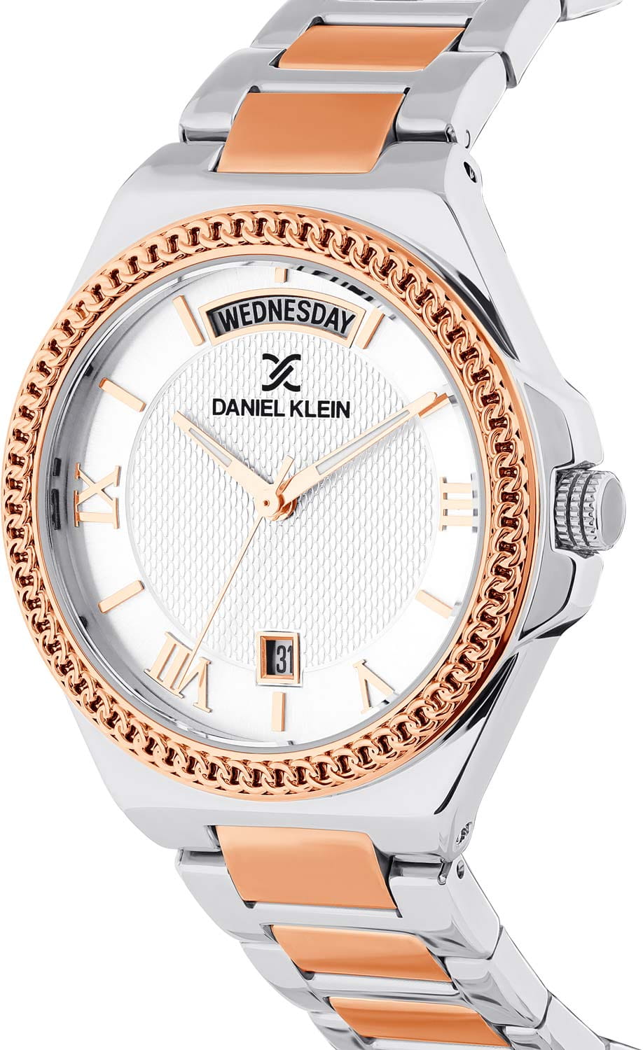 Женские кварцевые часы Daniel Klein — это оригинальный и функциональный аксессуар. Корпус диаметром 35 мм выполнен из нержавеющей стали. БезельБезельВнешний ободок, закрепляющий стекло. В спортивных часах так называется поворотное кольцо с делениями на циферблате, выполняет роль таймера – замеряет отрезки времени на шкале. Неподвижный безель – элемент декора. Однонаправленно вращающийся безель на дайверских часах позволяет фиксировать моменты погружения и выныривания на поверхность. с IP-покрытиемIP-покрытиеМетод ионного напыления. Демонстрирует повышенную устойчивость к истиранию, окислению и химическим веществам. Под воздействием высокого давления и температуры около 1500°C молекулы металла надёжно соединяются с частицами корпуса часов. декорирован узором. Циферблат белого цвета имеет гильошированную центральную часть и зону меток, выполненную по технологии Sunray («солнечные лучи»). Индексы представлены штрихами и римскими цифрами. Окошко дня недели расположено в положении 12 часов, окошко даты — в положении 6 часов. Стрелки с люминесцентным покрытиемЛюминесцентное покрытиеПозволяет считывать показания времени в темноте. Производители наносят на стрелки, часовые индексы, безель или поверхность циферблата светонакопительный состав, дающий холодное свечение., обеспечивающим хорошую читаемость в темноте. Циферблат защищён минеральным стекломМинеральное стеклоМинеральное стекло представляет собой искусственно выращенный минерал кварца. Такое стекло отличается особой устойчивостью к повреждениям и царапинам. Уступает по некоторым качествам сапфировому стеклу.. Заводная головка рифлёная, с защитой. Часы оснащены стальным браслетом с частичным IP-покрытиемIP-покрытиеМетод ионного напыления. Демонстрирует повышенную устойчивость к истиранию, окислению и химическим веществам. Под воздействием высокого давления и температуры около 1500°C молекулы металла надёжно соединяются с частицами корпуса часов. на раскладной застёжкеРаскладная застёжкаТакой тип застёжки используется только на браслетах из металла. Она никогда не раскрывается полностью, происходит разделение на 2 и более частей. Раскладывающая застёжка снизит вероятность потери часов к минимуму.. Водонепроницаемость 30 м позволяет использовать часы в повседневных условиях. Идеальный выбор для тех, кто ценит турецкое качество и универсальный дизайн.