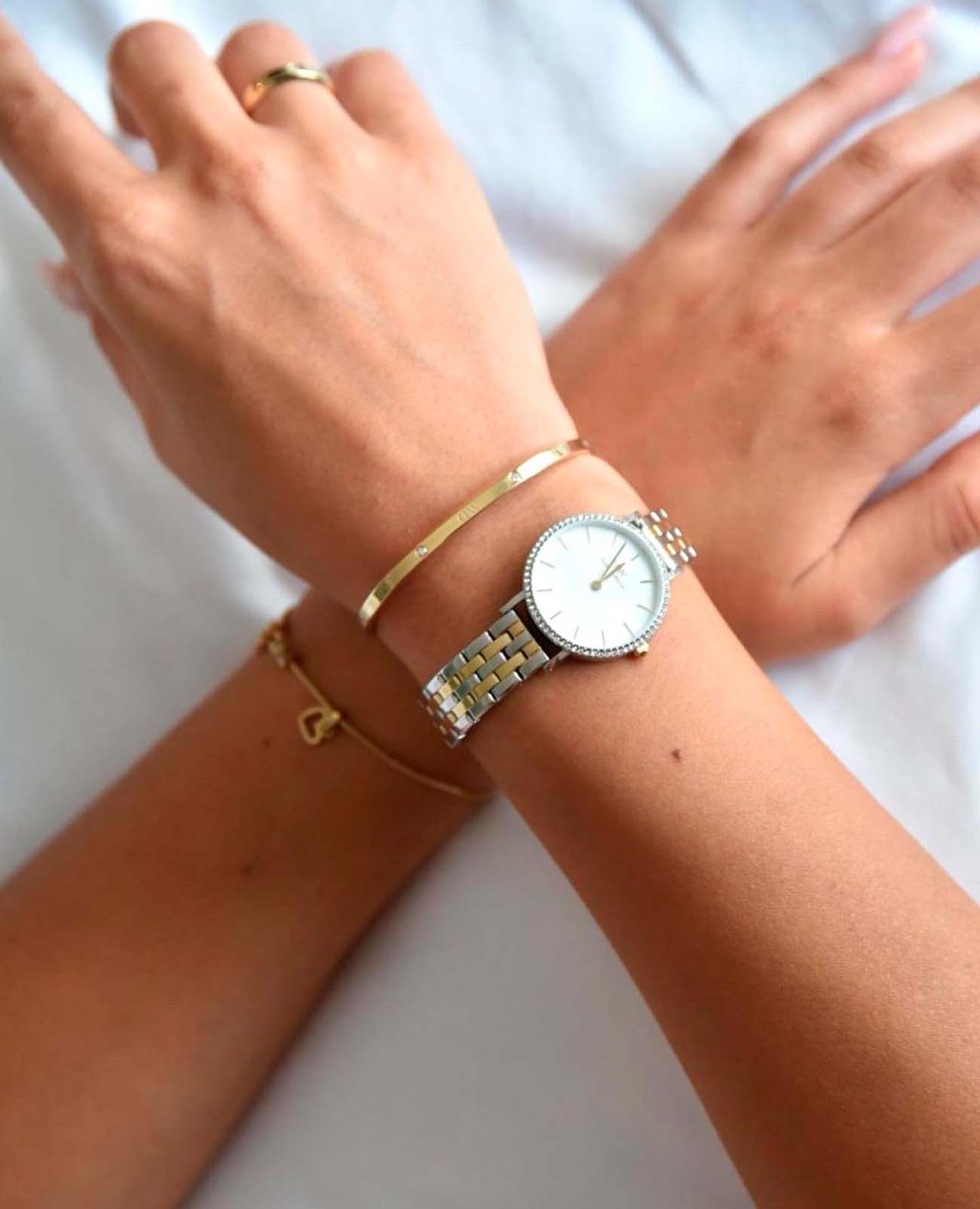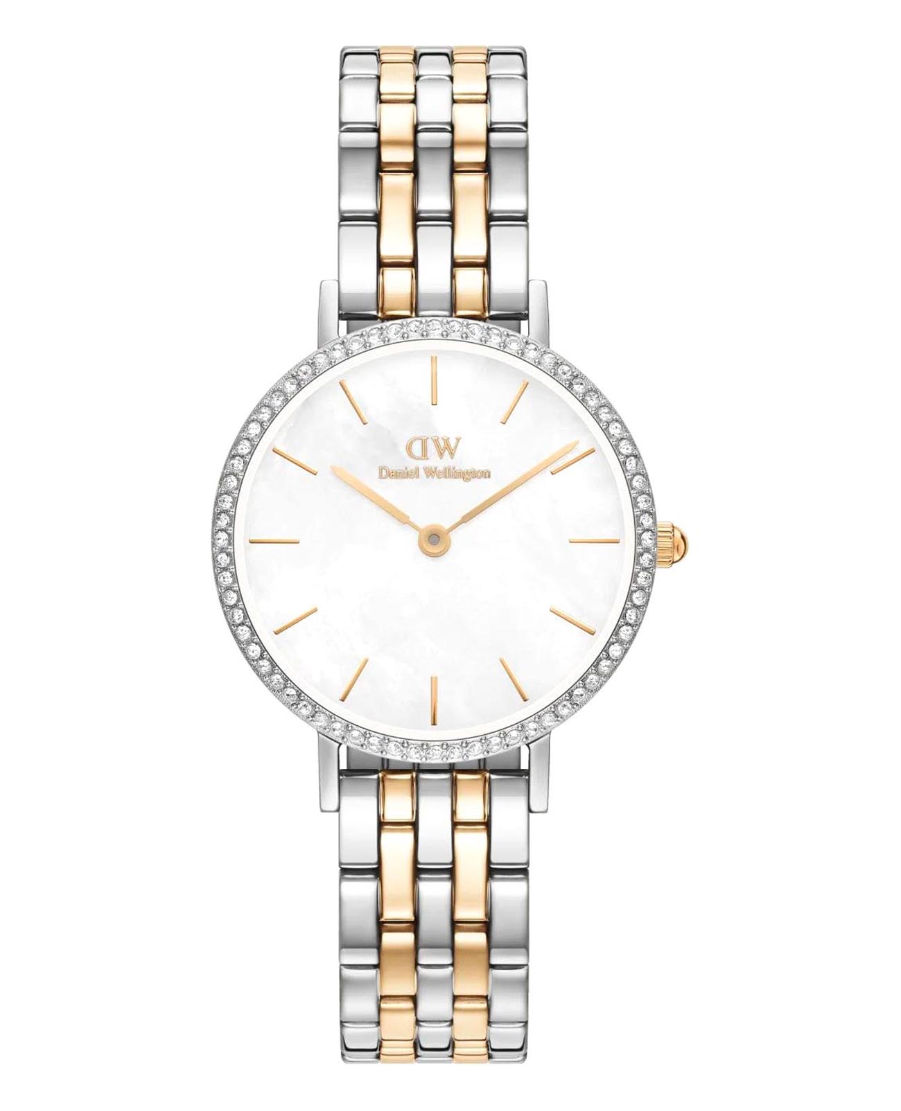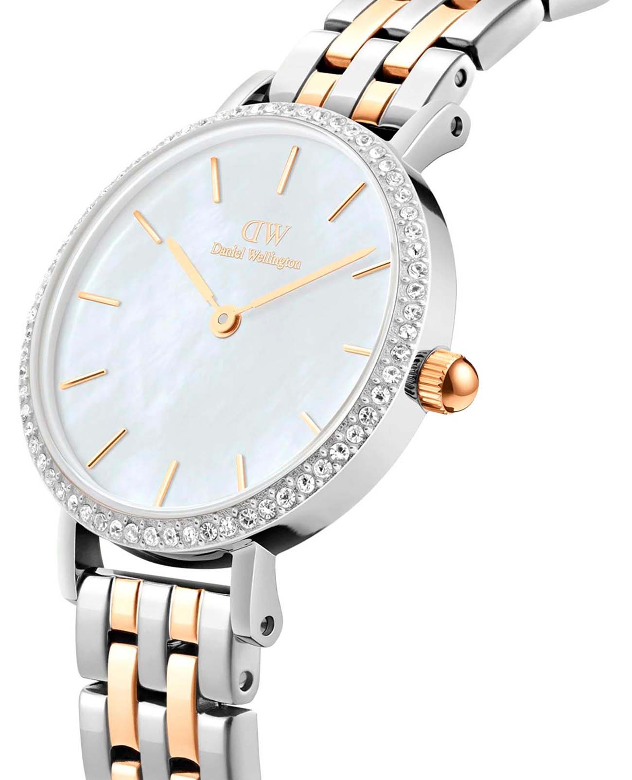 Женские наручные часы с минеральным стекломМинеральное стеклоМинеральное стекло представляет собой искусственно выращенный минерал кварца. Такое стекло отличается особой устойчивостью к повреждениям и царапинам. Уступает по некоторым качествам сапфировому стеклу. Daniel Wellington Petite DW00100665, кварцевый механизм с высокой точностью. Корпус часов изготовлен из стали. БезельБезельВнешний ободок, закрепляющий стекло. В спортивных часах так называется поворотное кольцо с делениями на циферблате, выполняет роль таймера – замеряет отрезки времени на шкале. Неподвижный безель – элемент декора. Однонаправленно вращающийся безель на дайверских часах позволяет фиксировать моменты погружения и выныривания на поверхность. украшен кристаллами Swarovski. Матовый циферблат украшен фирменным логотипом Daniel Wellington. Накладные метки в виде штрихов. Японский кварцевый механизм. Рифленая заводная головка. Класс водозащиты: 30 метров, позволит защитить корпус от случайных брызг или капель дождя. Стальной браслет с частичным PVD-покрытиемPVDУльтратонкое покрытие наносится в технике вакуумного напыления, сочетает в себе нитрид титана особой прочности со слоем золота или оксида хрома. Несёт в себе декоративную или защитную функцию. на застёжке-бабочке с кнопкамиЗастёжка "бабочка"Такой вид застёжки дополняется предохранителями, помогающими избежать случайного раскрытия браслета. Обладают изящным исполнением. .
