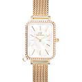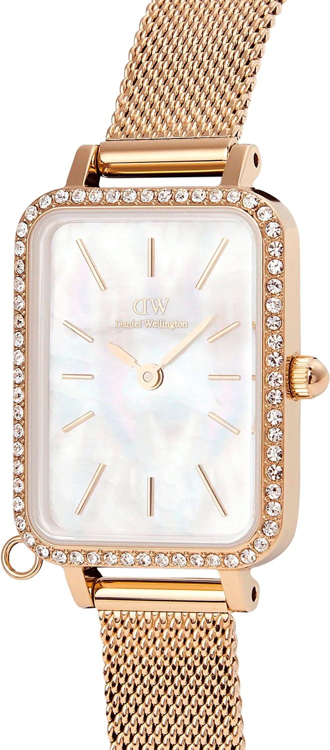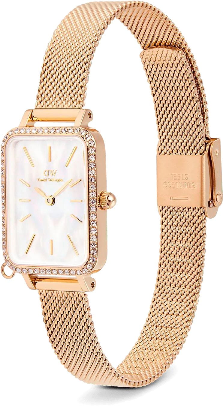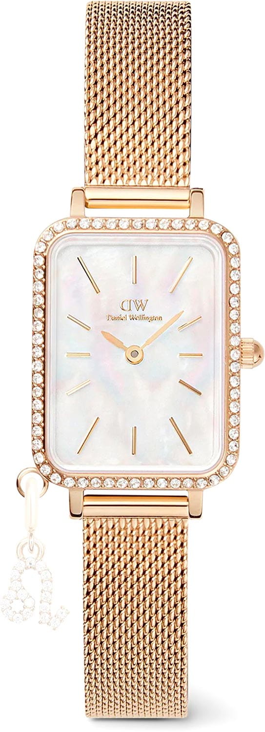 Женские наручные часы с минеральным стекломМинеральное стеклоМинеральное стекло представляет собой искусственно выращенный минерал кварца. Такое стекло отличается особой устойчивостью к повреждениям и царапинам. Уступает по некоторым качествам сапфировому стеклу. Daniel Wellington Quadro Crystal Zodiac Evergold DW00100749, кварцевый механизм с высокой точностью. Корпус часов изготовлен из нержавеющей стали с PVD-покрытиемPVDУльтратонкое покрытие наносится в технике вакуумного напыления, сочетает в себе нитрид титана особой прочности со слоем золота или оксида хрома. Несёт в себе декоративную или защитную функцию.. БезельБезельВнешний ободок, закрепляющий стекло. В спортивных часах так называется поворотное кольцо с делениями на циферблате, выполняет роль таймера – замеряет отрезки времени на шкале. Неподвижный безель – элемент декора. Однонаправленно вращающийся безель на дайверских часах позволяет фиксировать моменты погружения и выныривания на поверхность. украшен кристаллами Swarovski. Матовый циферблат украшен фирменным логотипом Daniel Wellington. Накладные метки в виде штрихов. Японский кварцевый механизм. Рифленая заводная головка. Класс водозащиты: 30 метров, позволит защитить корпус от случайных брызг или капель дождя. Стальной браслет миланского плетения с PVD-покрытиемPVDУльтратонкое покрытие наносится в технике вакуумного напыления, сочетает в себе нитрид титана особой прочности со слоем золота или оксида хрома. Несёт в себе декоративную или защитную функцию. на раскладном замкеРаскладной замокДанный вариант застежки используется только на часах с металлическим браслетом. Отличительная особенность такого крепления в том, что длина браслета становится универсальной и вы можете самостоятельно отрегулировать нужный вам размер – застежка просто двигается по браслету часов..Корпус дополнен колечком для подвески.