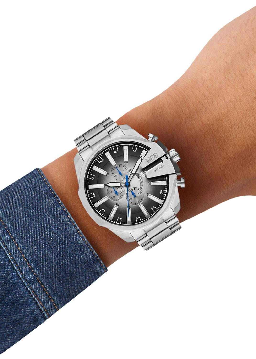 Часы Diesel Mega Chief Slim DZ4686 — это современная модель для стильных мужчин, сочетающая функциональность и высококачественные материалы. Часы оснащены кварцевым механизмом, который обеспечивает высокую точность хода. Корпус диаметром 48 мм выполнен из нержавеющей стали, а минеральное стеклоМинеральное стеклоМинеральное стекло представляет собой искусственно выращенный минерал кварца. Такое стекло отличается особой устойчивостью к повреждениям и царапинам. Уступает по некоторым качествам сапфировому стеклу. защищает циферблат от царапин. Черный циферблат оснащён стрелками и метками  с люминесцентным покрытиемЛюминесцентное покрытиеПозволяет считывать показания времени в темноте. Производители наносят на стрелки, часовые индексы, безель или поверхность циферблата светонакопительный состав, дающий холодное свечение., обеспечивающими удобство чтения даже в условиях низкой освещённости. Окошко даты расположено на отметке 3 часа. Функция хронографаХронографФункция позволяет измерять отрезки времени с особой точностью: часы, минуты, секунды. Верным признаком хронографа является наличие на циферблате 3 дополнительных окошек-счётчиков. позволяет измерять промежутки времени с высокой точностью. Часы оснащены стальным браслетом с раскладной застёжкойРаскладная застёжкаТакой тип застёжки используется только на браслетах из металла. Она никогда не раскрывается полностью, происходит разделение на 2 и более частей. Раскладывающая застёжка снизит вероятность потери часов к минимуму., обеспечивая комфортное ношение и добавляя стильный акцент.  Водозащита 50 метров защищает часы от брызг и дождя, делая их подходящими для повседневного использования. Diesel — это идеальное сочетание современного дизайна, надёжности и практичности.