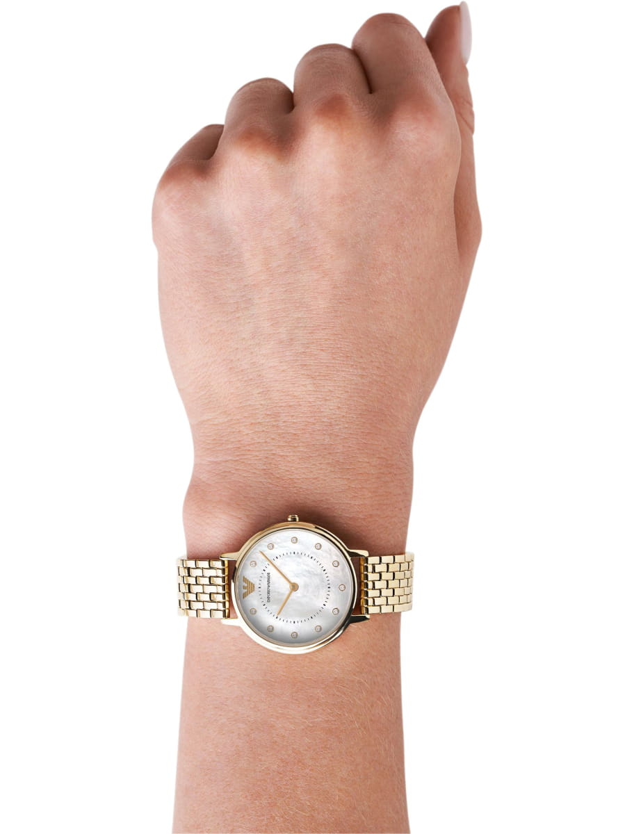 Женские кварцевые часы Emporio Armani из серии Kappa — это стильная новинка, сочетающая элегантность итальянского дизайна с надёжностью японского механизма. Корпус выполнен из нержавеющей стали с золотистым покрытием, которое реализовано по технологии PVD-покрытиеPVDУльтратонкое покрытие наносится в технике вакуумного напыления, сочетает в себе нитрид титана особой прочности со слоем золота или оксида хрома. Несёт в себе декоративную или защитную функцию.. Часы защищены минеральным стекломМинеральное стеклоМинеральное стекло представляет собой искусственно выращенный минерал кварца. Такое стекло отличается особой устойчивостью к повреждениям и царапинам. Уступает по некоторым качествам сапфировому стеклу.. Циферблат круглой формы выполнен в перламутровом цвете, придающем модели изысканный блеск, а индикация представлена золотистыми точками. Браслет из нержавеющей стали с золотистым покрытием фиксируется на застёжке «бабочка» с кнопкамиЗастёжка "бабочка"Такой вид застёжки дополняется предохранителями, помогающими избежать случайного раскрытия браслета. Обладают изящным исполнением. , обеспечивая удобство и надёжность ношения. Водонепроницаемость составляет 30 WR, что позволяет защитить часы от случайных брызг и капель дождя. Модель подчеркивает женственность и утончённый вкус владельца, идеально подходя как для повседневного, так и для вечернего образа.