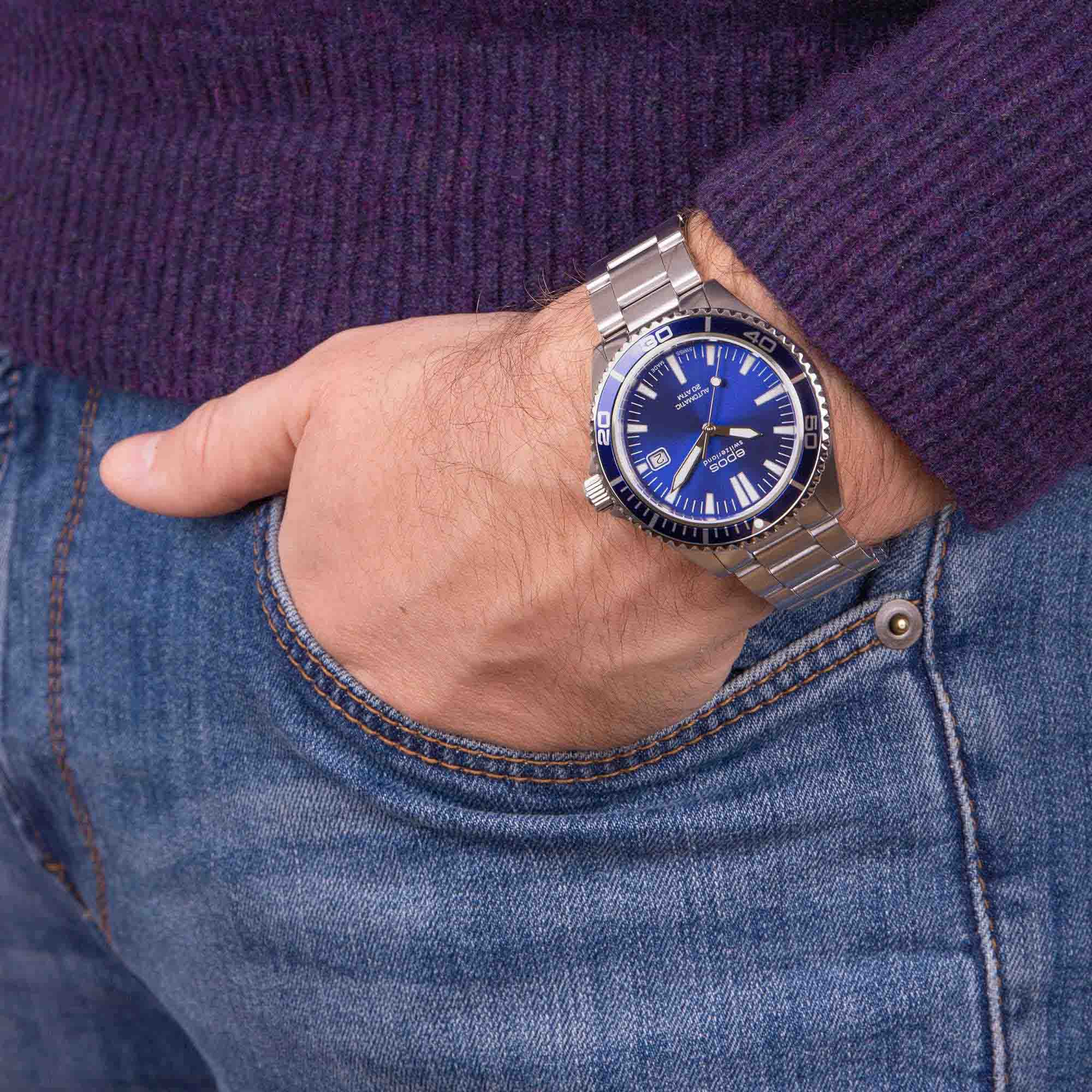 Мужские механические часы с автоподзаводом Epos из коллекции Diver — это надёжный инструмент для активного образа жизни. Корпус диаметром 41 мм и толщиной 12 мм выполнен из нержавеющей стали 316L. Циферблат синего цвета оформлен с матовой поверхностью, с печатными индексами и стрелками с покрытием цвета родия. Циферблат защищён сапфировым стекломСапфировое стеклоПрочный и надёжный материал из кристалла сапфира синтетического происхождения, характеризующийся особой твёрдостью и устойчивостью к царапинам и повреждениям.. Стрелки и метки с люминесцентным покрытиемЛюминесцентное покрытиеПозволяет считывать показания времени в темноте. Производители наносят на стрелки, часовые индексы, безель или поверхность циферблата светонакопительный состав, дающий холодное свечение. Super-Luminova, обеспечивающим отличную читаемость в темноте. Механизм — швейцарский калибр ETA 2824. Окошко даты расположено в положении 3 часов. БезельБезельВнешний ободок, закрепляющий стекло. В спортивных часах так называется поворотное кольцо с делениями на циферблате, выполняет роль таймера – замеряет отрезки времени на шкале. Неподвижный безель – элемент декора. Однонаправленно вращающийся безель на дайверских часах позволяет фиксировать моменты погружения и выныривания на поверхность. — однонаправленный вращающийся, с PVD-покрытиемPVDУльтратонкое покрытие наносится в технике вакуумного напыления, сочетает в себе нитрид титана особой прочности со слоем золота или оксида хрома. Несёт в себе декоративную или защитную функцию.. и шкалой погружений, что делает часы пригодными для дайвинга. Завинчивающаяся коронка и задняя крышка обеспечивают повышенную защиту. Часы оснащены стальным браслетом с литыми звеньями в 3 ряда и раскладной застёжкойРаскладная застёжкаТакой тип застёжки используется только на браслетах из металла. Она никогда не раскрывается полностью, происходит разделение на 2 и более частей. Раскладывающая застёжка снизит вероятность потери часов к минимуму. с дополнительным фиксатором. Водонепроницаемость 200 м позволяет использовать часы для глубоководных погружений. Гарантия — 24 месяца. Идеальный выбор для тех, кто ценит точность, прочность и функциональность.